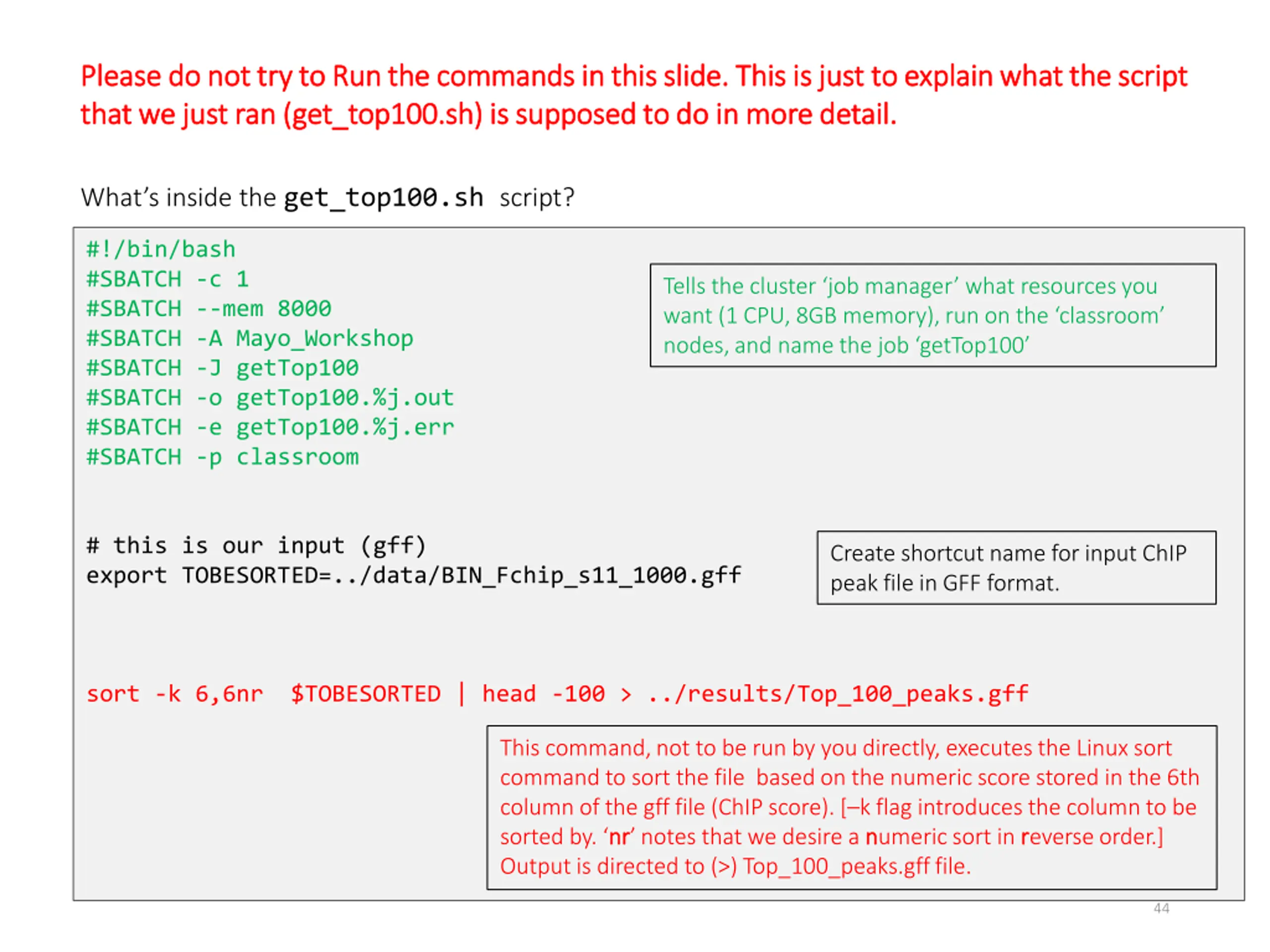 Please do not try to Run the commands in this slide. This is just to explain what the script Please do not try to Run the commands in this slide. This is just to explain what the script that we just ran (get_top100.sh) is supposed to do in more detail. that we just ran (get_top100.sh) is supposed to do in more detail. What s inside the get_top100.sh script? #!/bin/bash #SBATCH -c 1 #SBATCH --mem 8000 #SBATCH -A Mayo_Workshop #SBATCH -J getTop100 #SBATCH -o getTop100.%j.out #SBATCH -e getTop100.%j.err #SBATCH -p classroom Tells the cluster job manager what resources you want (1 CPU, 8GB memory), run on the classroom nodes, and name the job getTop100 # this is our input (gff) export TOBESORTED=../data/BIN_Fchip_s11_1000.gff Create shortcut name for input ChIP peak file in GFF format. sort -k 6,6nr $TOBESORTED | head -100 > ../results/Top_100_peaks.gff This command, not to be run by you directly, executes the Linux sort command to sort the file based on the numeric score stored in the 6th column of the gff file (ChIP score). [ k flag introduces the column to be sorted by. nr nr notes that we desire a n numeric sort in r reverse order.] Output is directed to (>) Top_100_peaks.gff file. 44