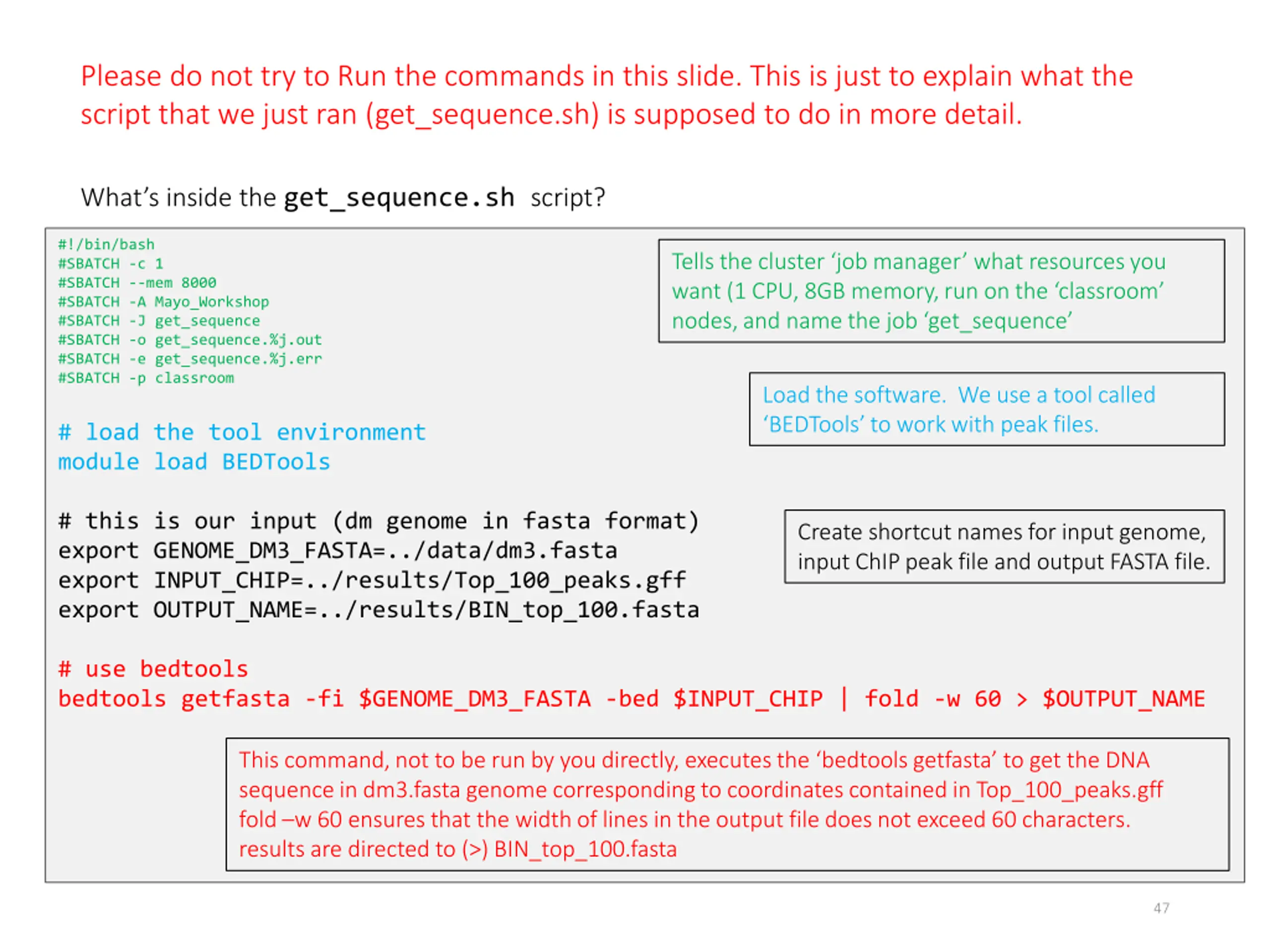 Please do not try to Run the commands in this slide. This is just to explain what the script that we just ran (get_sequence.sh) is supposed to do in more detail. What s inside the get_sequence.sh script? #!/bin/bash #SBATCH -c 1 #SBATCH --mem 8000 #SBATCH -A Mayo_Workshop #SBATCH -J get_sequence #SBATCH -o get_sequence.%j.out #SBATCH -e get_sequence.%j.err #SBATCH -p classroom Tells the cluster job manager what resources you want (1 CPU, 8GB memory, run on the classroom nodes, and name the job get_sequence Load the software. We use a tool called BEDTools to work with peak files. # load the tool environment module load BEDTools # this is our input (dm genome in fasta format) export GENOME_DM3_FASTA=../data/dm3.fasta export INPUT_CHIP=../results/Top_100_peaks.gff export OUTPUT_NAME=../results/BIN_top_100.fasta Create shortcut names for input genome, input ChIP peak file and output FASTA file. # use bedtools bedtools getfasta -fi $GENOME_DM3_FASTA -bed $INPUT_CHIP | fold -w 60 > $OUTPUT_NAME This command, not to be run by you directly, executes the bedtools getfasta to get the DNA sequence in dm3.fasta genome corresponding to coordinates contained in Top_100_peaks.gff fold w 60 ensures that the width of lines in the output file does not exceed 60 characters. results are directed to (>) BIN_top_100.fasta 47