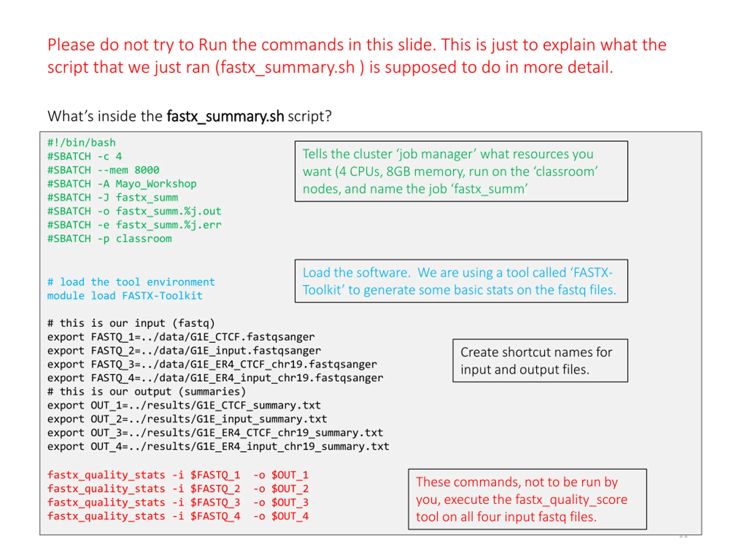 Please do not try to Run the commands in this slide. This is just to explain what the script that we just ran (fastx_summary.sh ) is supposed to do in more detail. What s inside the fastx_summary.sh fastx_summary.sh script? #!/bin/bash #SBATCH -c 4 #SBATCH --mem 8000 #SBATCH -A Mayo_Workshop #SBATCH -J fastx_summ #SBATCH -o fastx_summ.%j.out #SBATCH -e fastx_summ.%j.err #SBATCH -p classroom Tells the cluster job manager what resources you want (4 CPUs, 8GB memory, run on the classroom nodes, and name the job fastx_summ Load the software. We are using a tool called FASTX- Toolkit to generate some basic stats on the fastq files. # load the tool environment module load FASTX-Toolkit # this is our input (fastq) export FASTQ_1=../data/G1E_CTCF.fastqsanger export FASTQ_2=../data/G1E_input.fastqsanger export FASTQ_3=../data/G1E_ER4_CTCF_chr19.fastqsanger export FASTQ_4=../data/G1E_ER4_input_chr19.fastqsanger # this is our output (summaries) export OUT_1=../results/G1E_CTCF_summary.txt export OUT_2=../results/G1E_input_summary.txt export OUT_3=../results/G1E_ER4_CTCF_chr19_summary.txt export OUT_4=../results/G1E_ER4_input_chr19_summary.txt Create shortcut names for input and output files. fastx_quality_stats -i $FASTQ_1 -o $OUT_1 fastx_quality_stats -i $FASTQ_2 -o $OUT_2 fastx_quality_stats -i $FASTQ_3 -o $OUT_3 fastx_quality_stats -i $FASTQ_4 -o $OUT_4 These commands, not to be run by you, execute the fastx_quality_score tool on all four input fastq files. 11