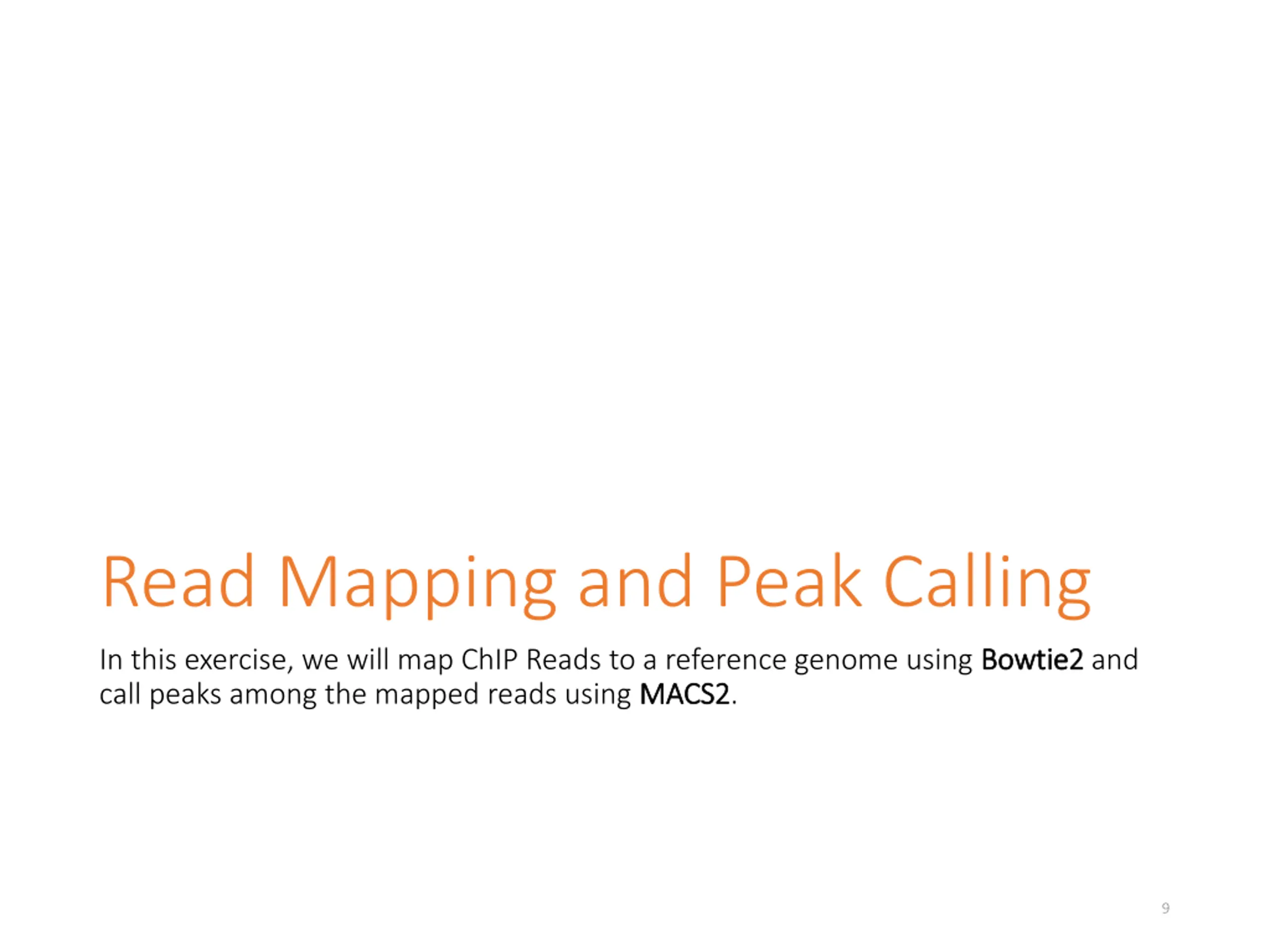 Read Mapping and Peak Calling In this exercise, we will map ChIP Reads to a reference genome using Bowtie2 call peaks among the mapped reads using MACS2 Bowtie2 and MACS2. 9