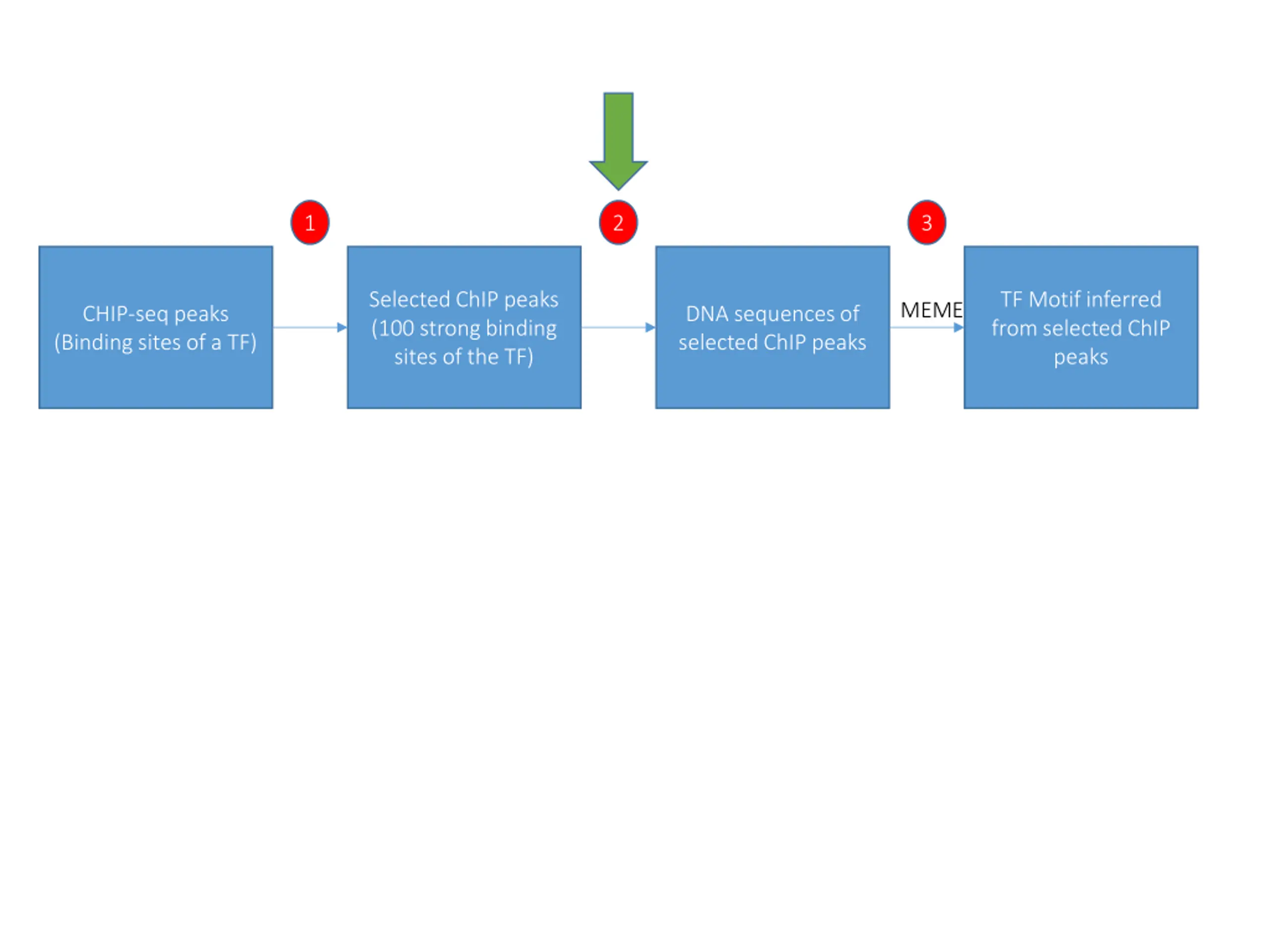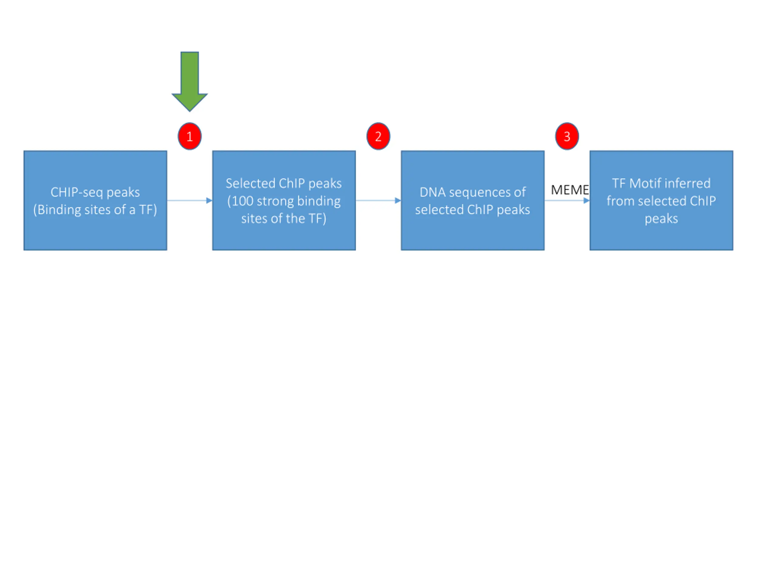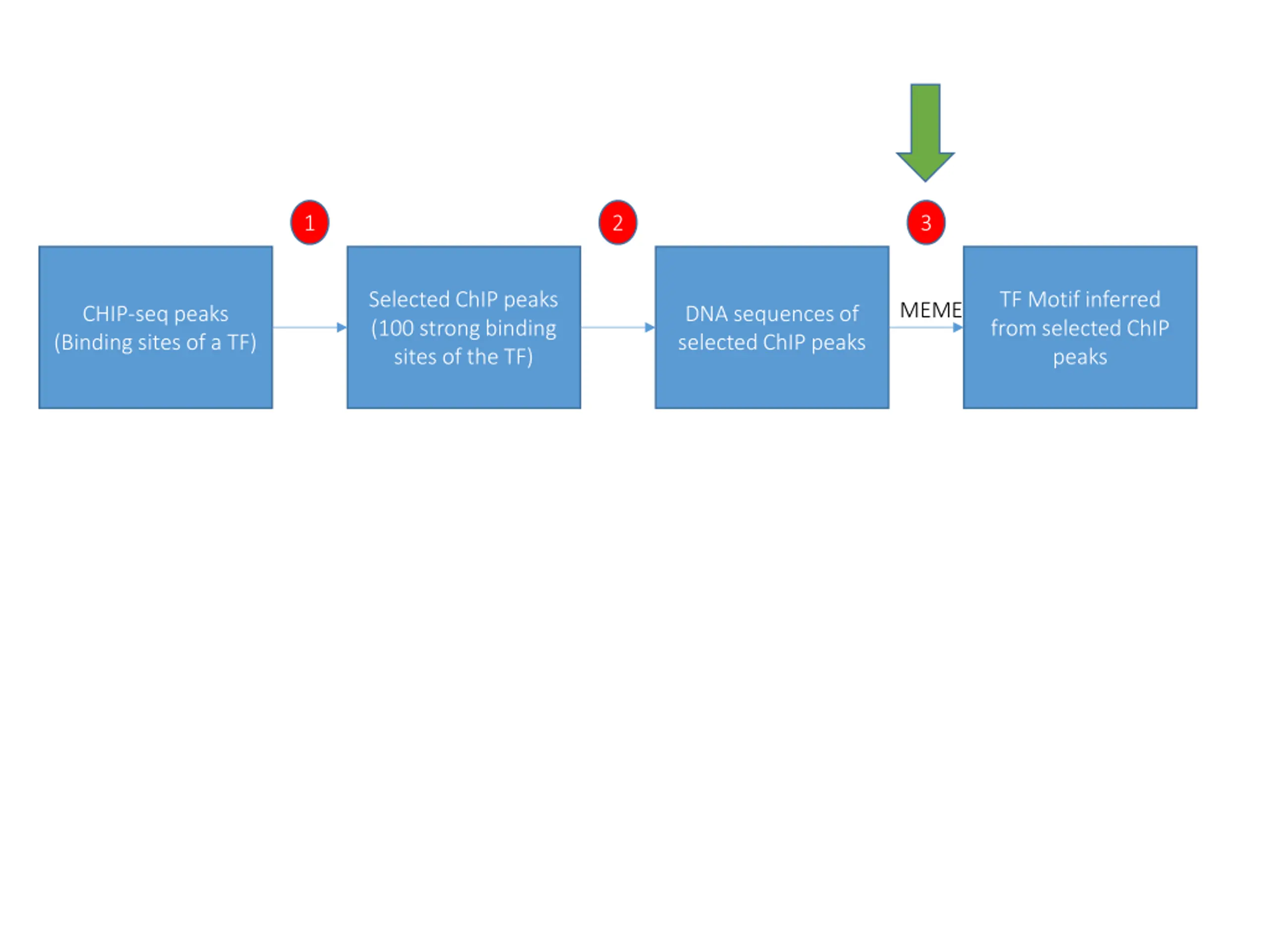 1 2 3 Selected ChIP peaks (100 strong binding sites of the TF) TF Motif inferred from selected ChIP peaks MEME CHIP-seq peaks (Binding sites of a TF) DNA sequences of selected ChIP peaks