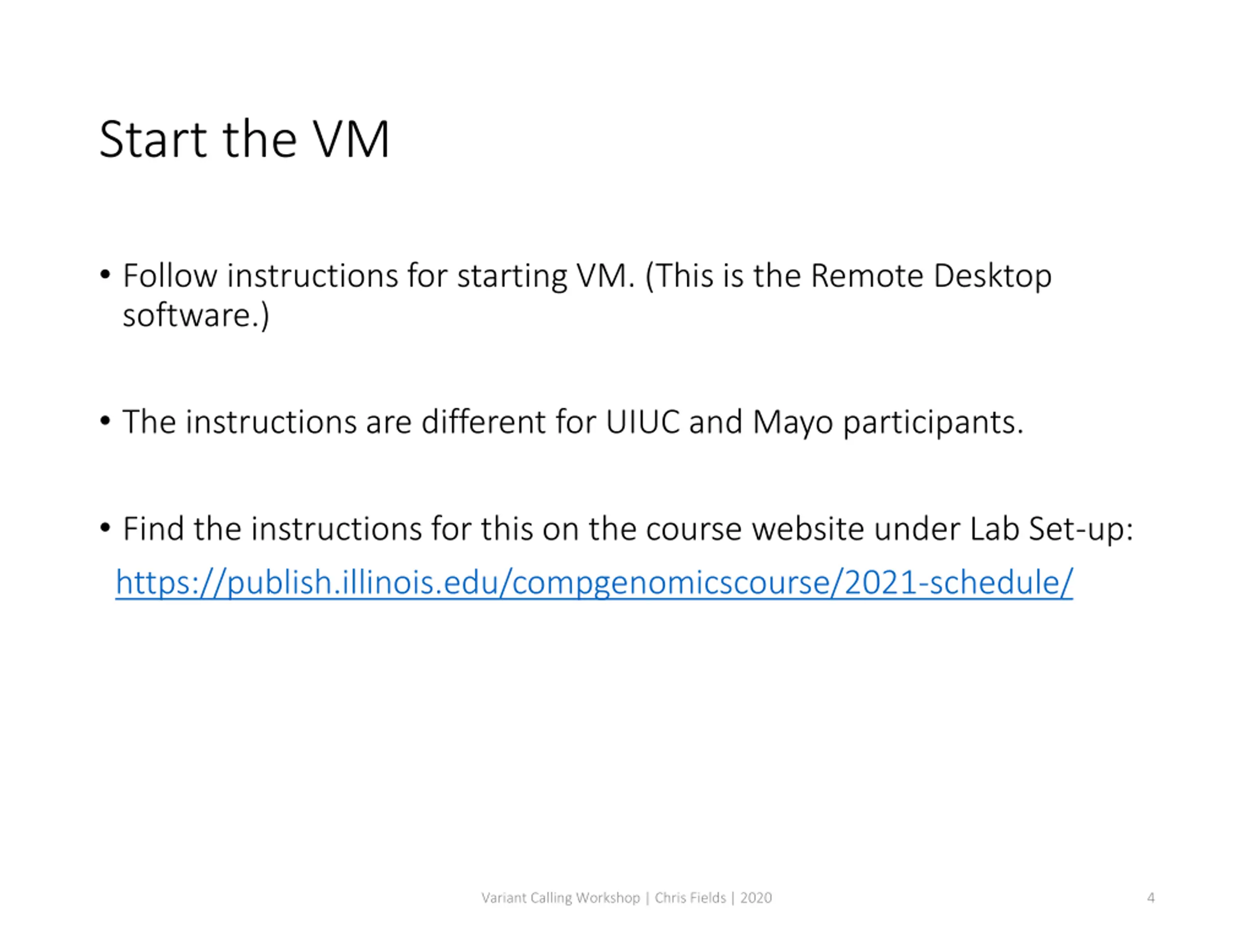 Start the VM Follow instructions for starting VM. (This is the Remote Desktop software.) The instructions are different for UIUC and Mayo participants. Find the instructions for this on the course website under Lab Set-up: https://publish.illinois.edu/compgenomicscourse/2021-schedule/ Variant Calling Workshop | Chris Fields | 2020 4