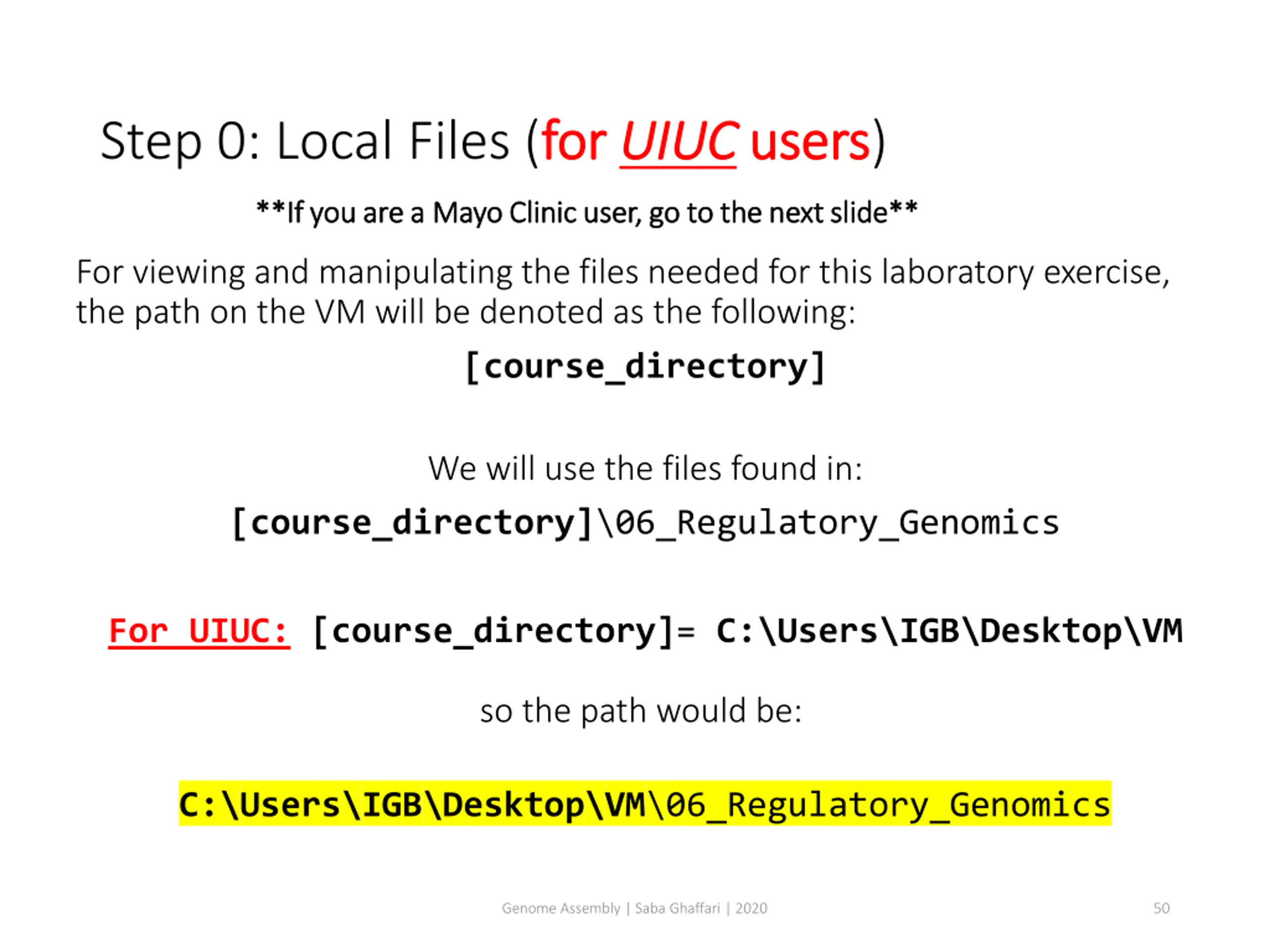 Step 0: Local Files (for for UIUC UIUC users users) **If you are a Mayo Clinic user, go to the next slide** **If you are a Mayo Clinic user, go to the next slide** For viewing and manipulating the files needed for this laboratory exercise, the path on the VM will be denoted as the following: [course_directory] We will use the files found in: [course_directory]\06_Regulatory_Genomics For UIUC: [course_directory]= C:\Users\IGB\Desktop\VM so the path would be: C:\Users\IGB\Desktop\VM\06_Regulatory_Genomics Genome Assembly | Saba Ghaffari | 2020 50