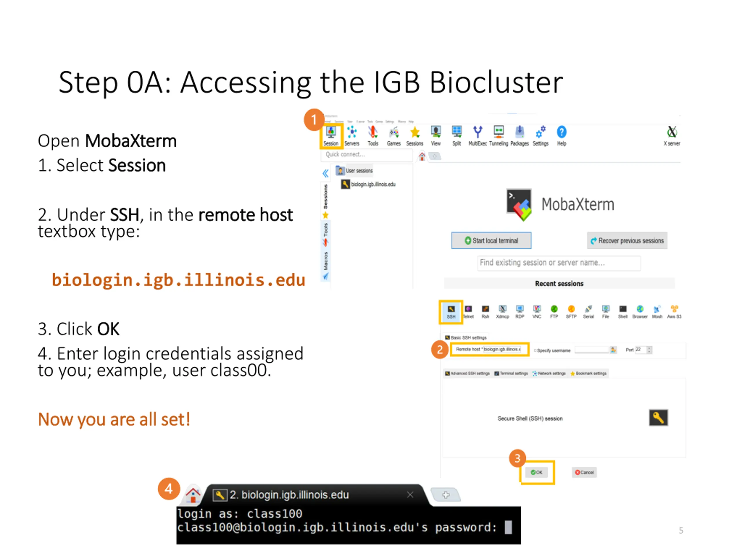 Step 0A: Accessing the IGB Biocluster Open MobaXterm MobaXterm 1. Select Session Session 2. Under SSH textbox type: SSH, in the remote host remote host biologin.igb.illinois.edu 3. Click OK 4. Enter login credentials assigned to you; example, user class00. OK Now you are all set! Now you are all set! 5