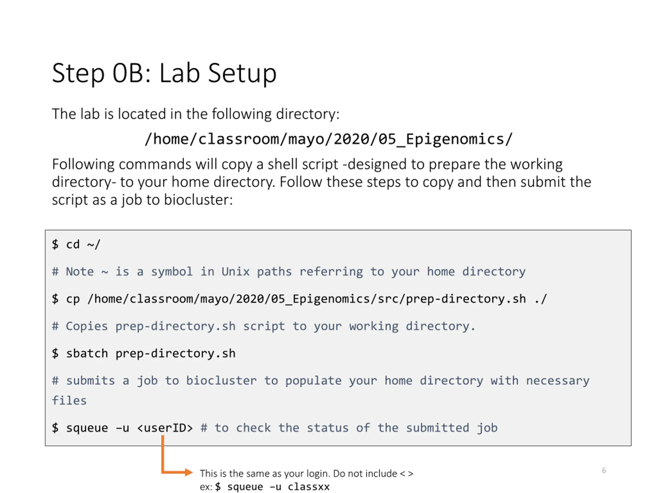 Step 0B: Lab Setup The lab is located in the following directory: /home/classroom/mayo/2020/05_Epigenomics/ Following commands will copy a shell script -designed to prepare the working directory- to your home directory. Follow these steps to copy and then submit the script as a job to biocluster: $ cd ~/ # Note ~ is a symbol in Unix paths referring to your home directory $ cp /home/classroom/mayo/2020/05_Epigenomics/src/prep-directory.sh ./ # Copies prep-directory.sh script to your working directory. $ sbatch prep-directory.sh # submits a job to biocluster to populate your home directory with necessary files $ squeue u <userID> # to check the status of the submitted job 6 This is the same as your login. Do not include < > ex: $ squeue u classxx