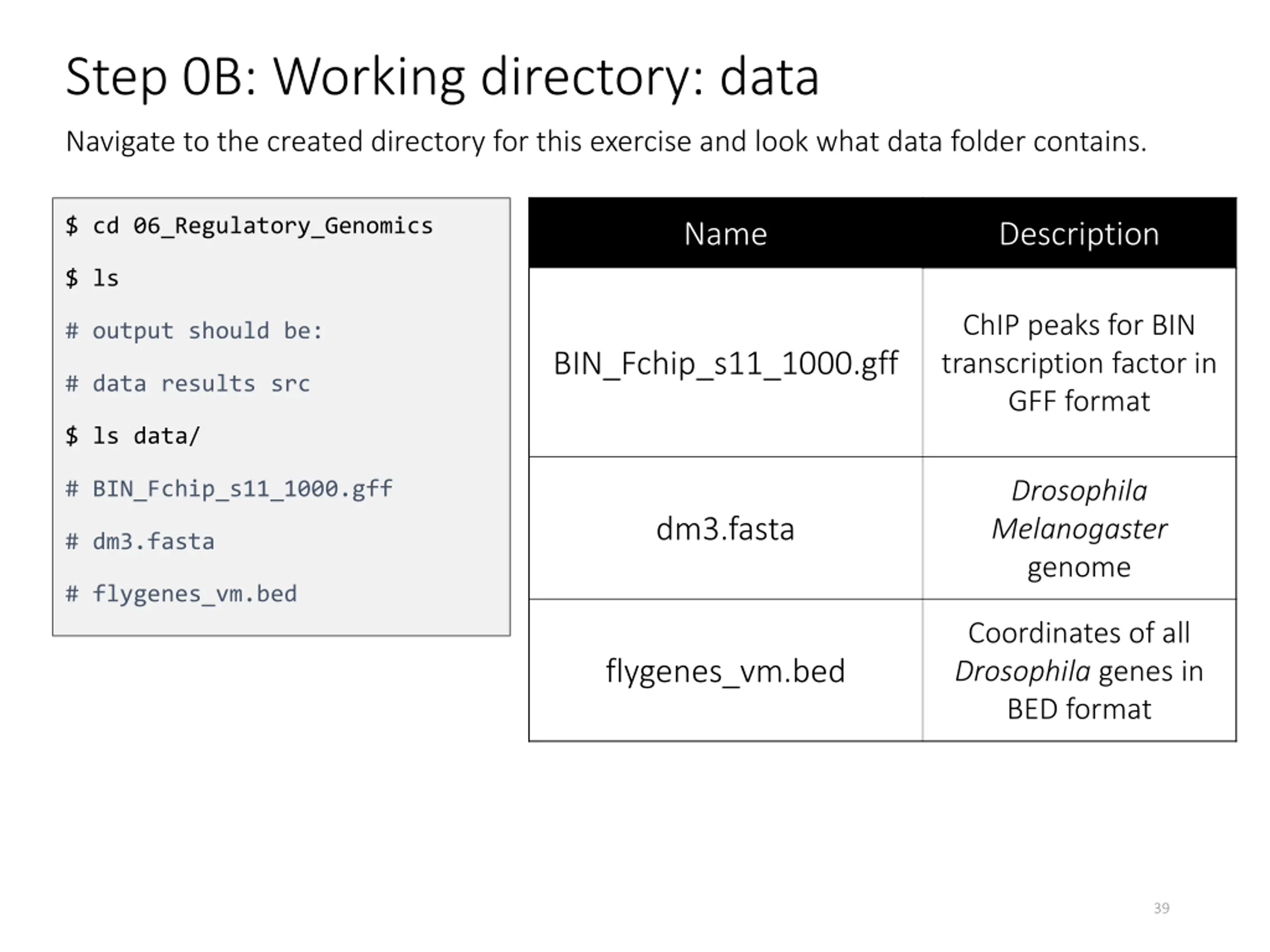 Step 0B: Working directory: data Navigate to the created directory for this exercise and look what data folder contains. $ cd 06_Regulatory_Genomics Name Description $ ls ChIP peaks for BIN transcription factor in GFF format # output should be: BIN_Fchip_s11_1000.gff # data results src $ ls data/ Drosophila Melanogaster genome # BIN_Fchip_s11_1000.gff dm3.fasta # dm3.fasta # flygenes_vm.bed Coordinates of all Drosophila genes in BED format flygenes_vm.bed 39