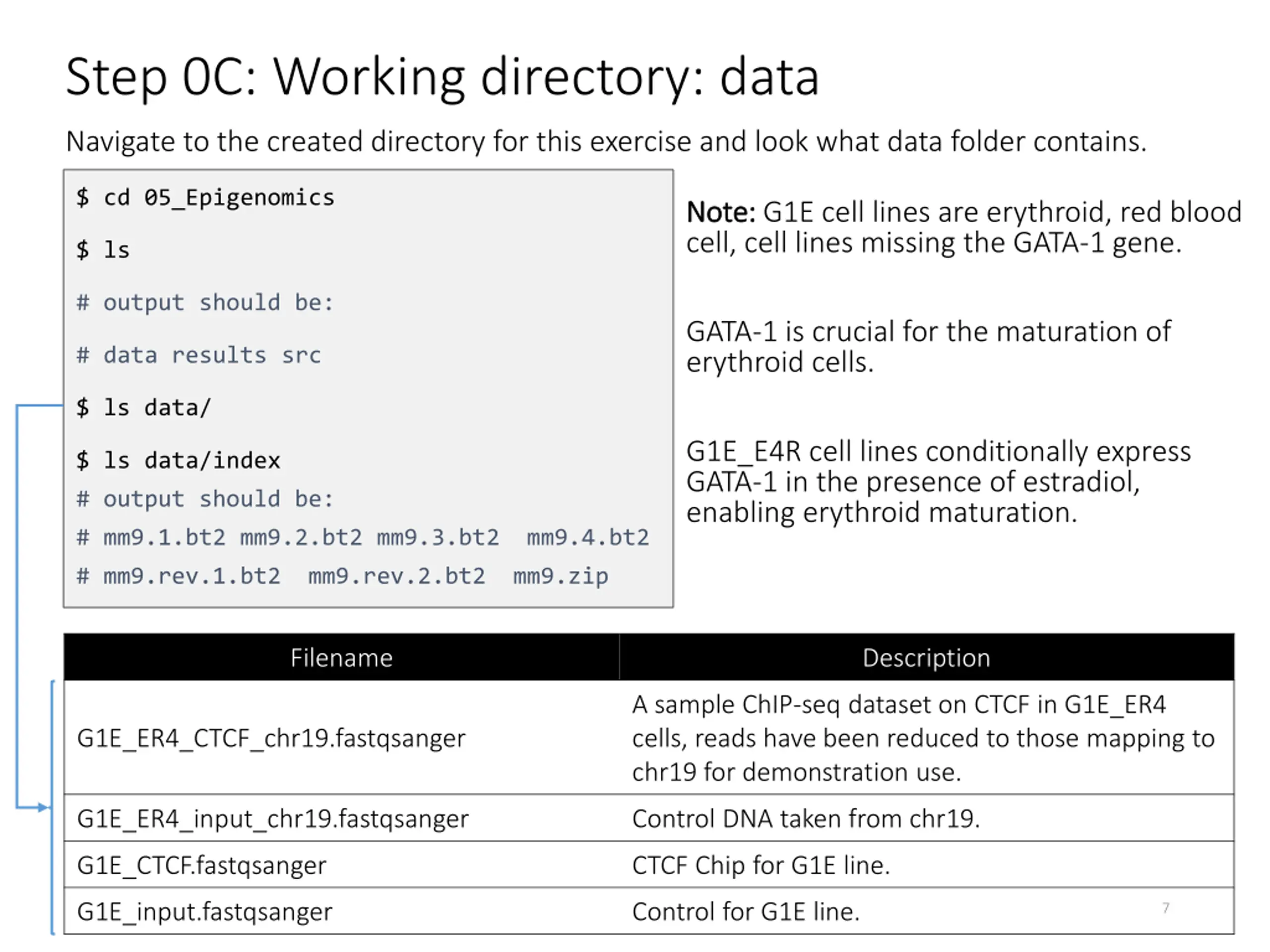 Step 0C: Working directory: data Navigate to the created directory for this exercise and look what data folder contains. $ cd 05_Epigenomics Note: Note: G1E cell lines are erythroid, red blood cell, cell lines missing the GATA-1 gene. $ ls # output should be: GATA-1 is crucial for the maturation of erythroid cells. # data results src $ ls data/ G1E_E4R cell lines conditionally express GATA-1 in the presence of estradiol, enabling erythroid maturation. $ ls data/index # output should be: # mm9.1.bt2 mm9.2.bt2 mm9.3.bt2 mm9.4.bt2 # mm9.rev.1.bt2 mm9.rev.2.bt2 mm9.zip Filename Description A sample ChIP-seq dataset on CTCF in G1E_ER4 cells, reads have been reduced to those mapping to chr19 for demonstration use. G1E_ER4_CTCF_chr19.fastqsanger G1E_ER4_input_chr19.fastqsanger Control DNA taken from chr19. G1E_CTCF.fastqsanger CTCF Chip for G1E line. G1E_input.fastqsanger Control for G1E line. 7