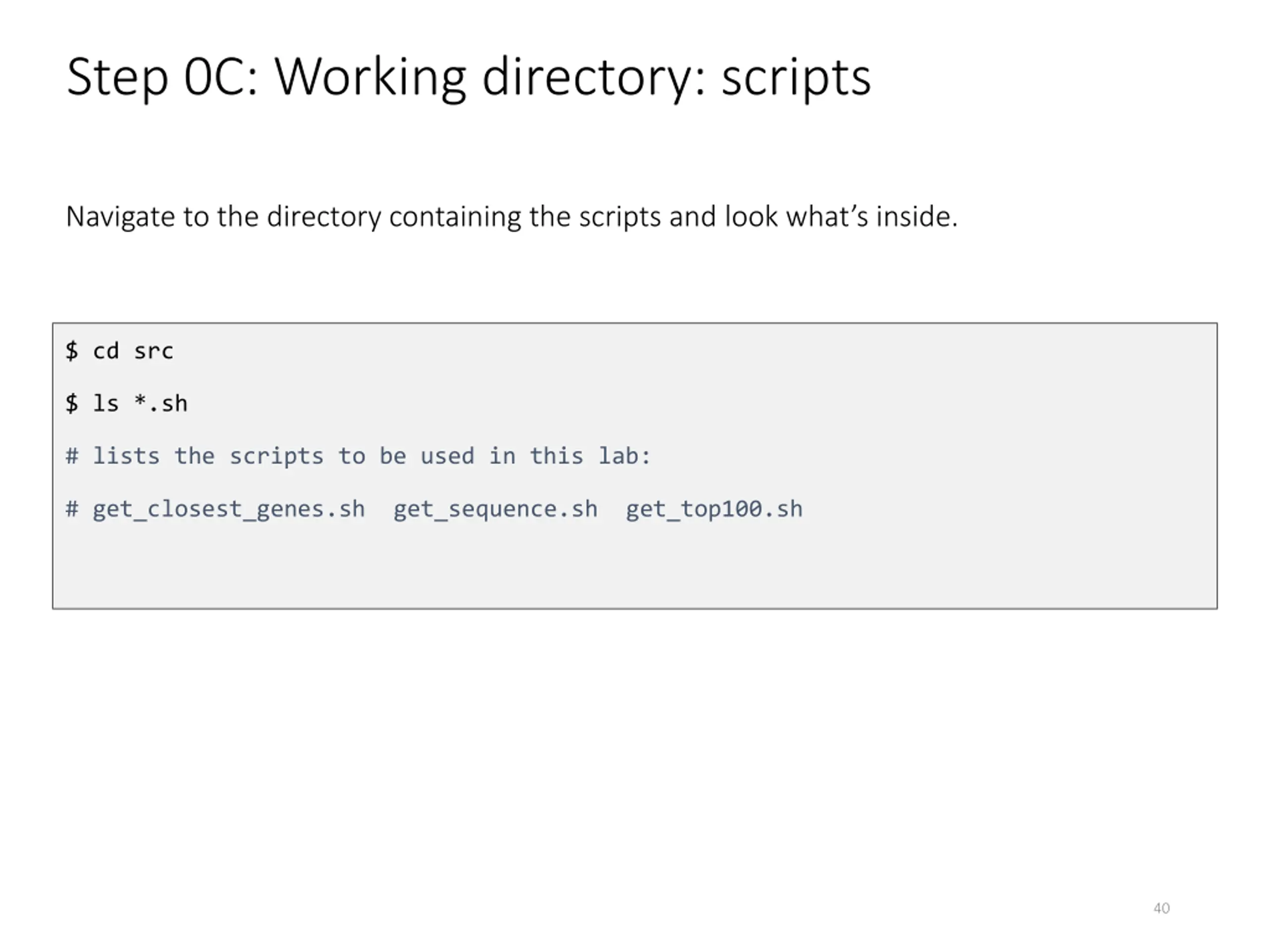 Step 0C: Working directory: scripts Navigate to the directory containing the scripts and look what s inside. $ cd src $ ls *.sh # lists the scripts to be used in this lab: # get_closest_genes.sh get_sequence.sh get_top100.sh 40