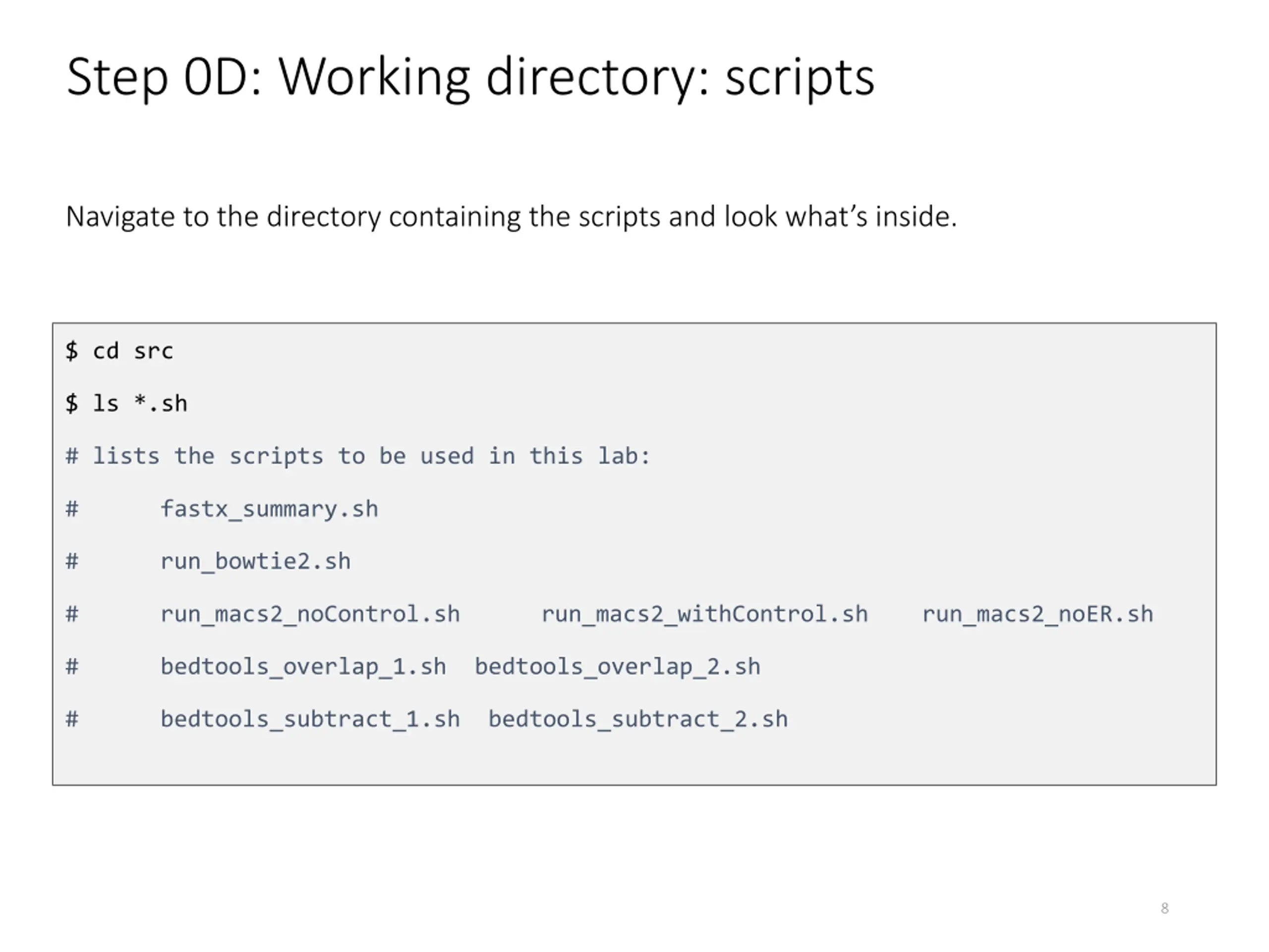 Step 0D: Working directory: scripts Navigate to the directory containing the scripts and look what s inside. $ cd src $ ls *.sh # lists the scripts to be used in this lab: # fastx_summary.sh # run_bowtie2.sh # run_macs2_noControl.sh run_macs2_withControl.sh run_macs2_noER.sh # bedtools_overlap_1.sh bedtools_overlap_2.sh # bedtools_subtract_1.sh bedtools_subtract_2.sh 8