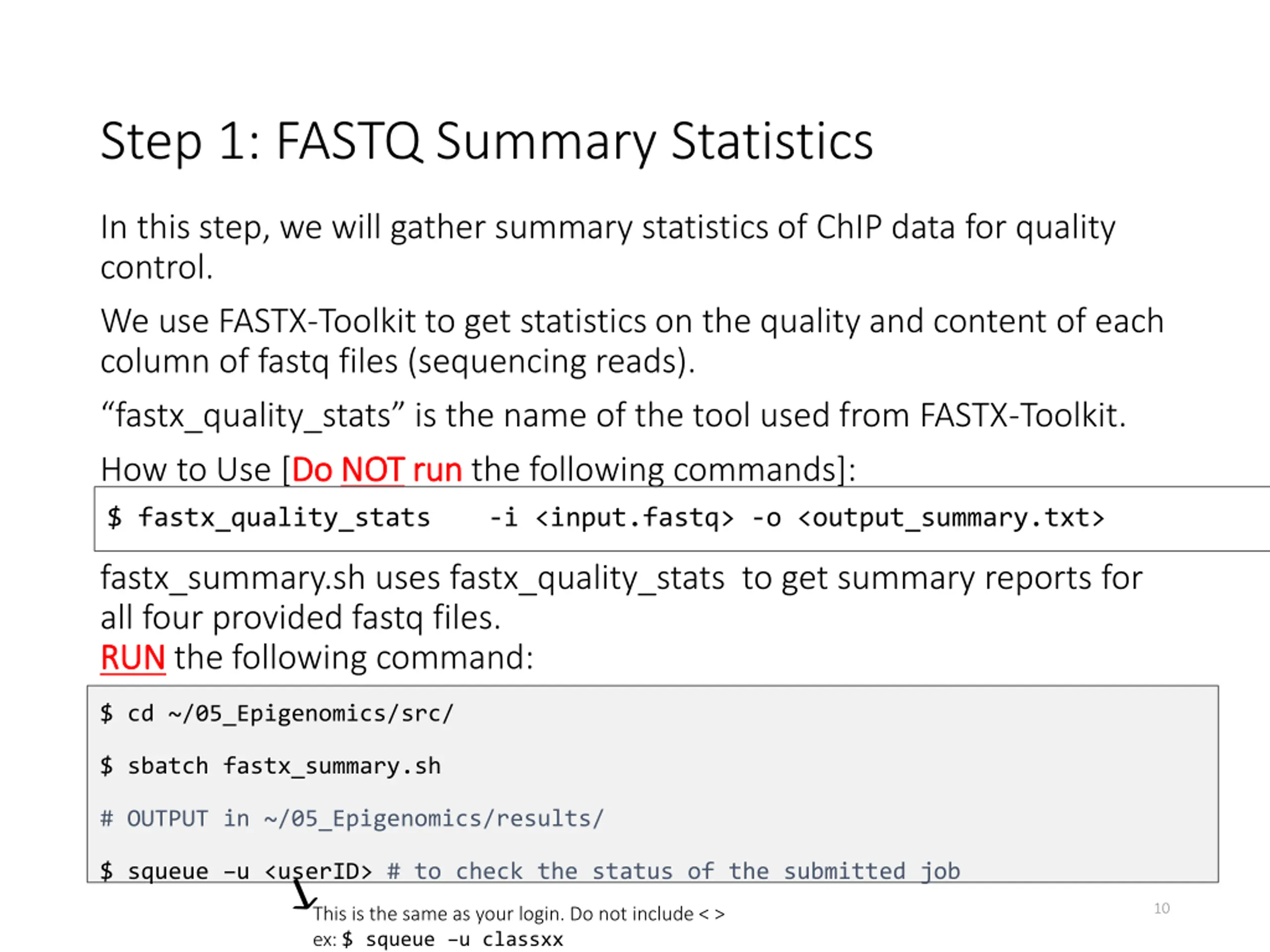 Step 1: FASTQ Summary Statistics In this step, we will gather summary statistics of ChIP data for quality control. We use FASTX-Toolkit to get statistics on the quality and content of each column of fastq files (sequencing reads). fastx_quality_stats is the name of the tool used from FASTX-Toolkit. How to Use [Do Do NOT NOT run run the following commands]: $ fastx_quality_stats -i <input.fastq> -o <output_summary.txt> fastx_summary.sh uses fastx_quality_stats to get summary reports for all four provided fastq files. RUN RUN the following command: $ cd ~/05_Epigenomics/src/ $ sbatch fastx_summary.sh # OUTPUT in ~/05_Epigenomics/results/ $ squeue u <userID> # to check the status of the submitted job 10 This is the same as your login. Do not include < > ex: $ squeue u classxx