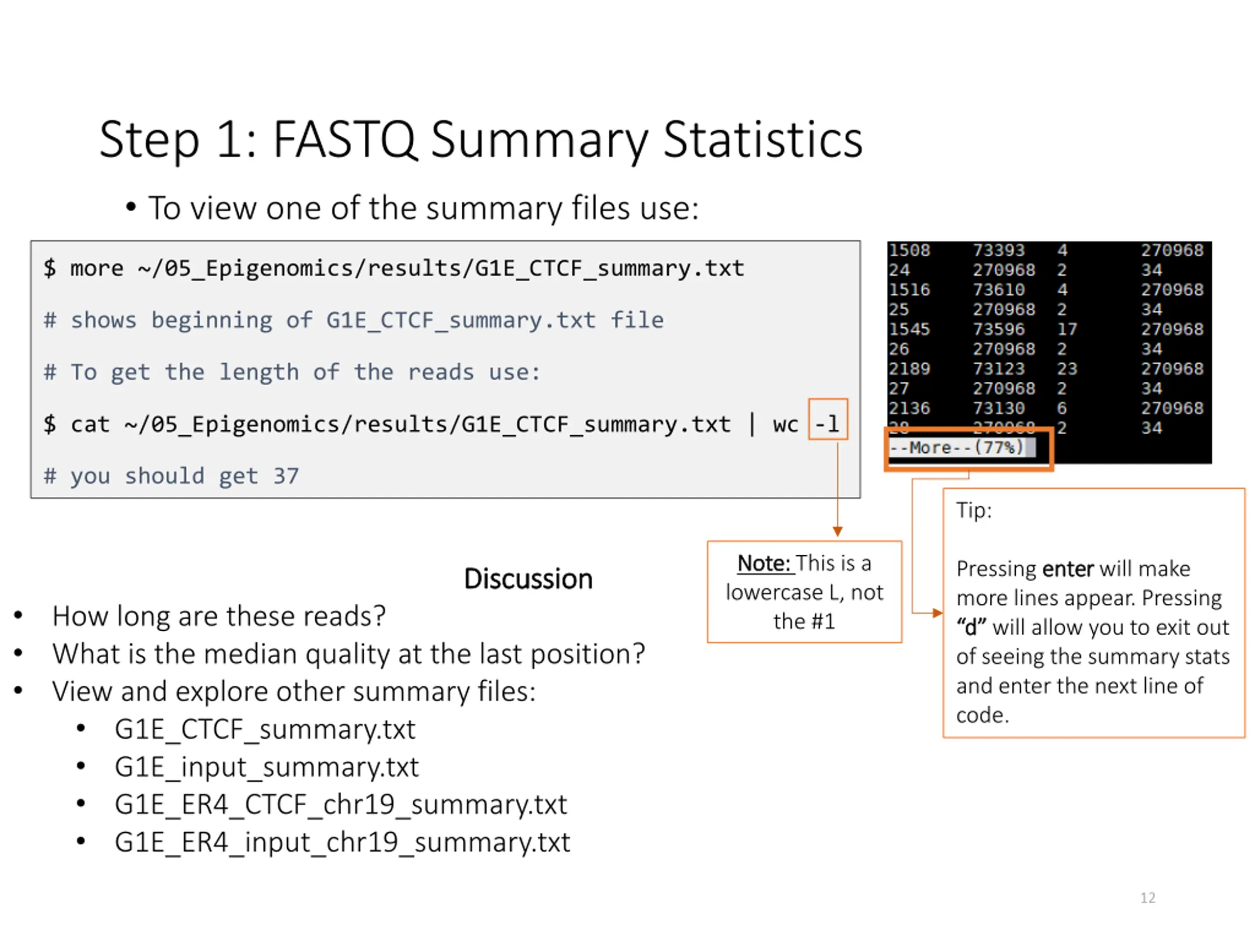 Step 1: FASTQ Summary Statistics To view one of the summary files use: $ more ~/05_Epigenomics/results/G1E_CTCF_summary.txt # shows beginning of G1E_CTCF_summary.txt file # To get the length of the reads use: $ cat ~/05_Epigenomics/results/G1E_CTCF_summary.txt | wc -l # you should get 37 Tip: Note: Note: This is a lowercase L, not the #1 Pressing enter more lines appear. Pressing d d will allow you to exit out of seeing the summary stats and enter the next line of code. enter will make Discussion Discussion How long are these reads? What is the median quality at the last position? View and explore other summary files: G1E_CTCF_summary.txt G1E_input_summary.txt G1E_ER4_CTCF_chr19_summary.txt G1E_ER4_input_chr19_summary.txt 12