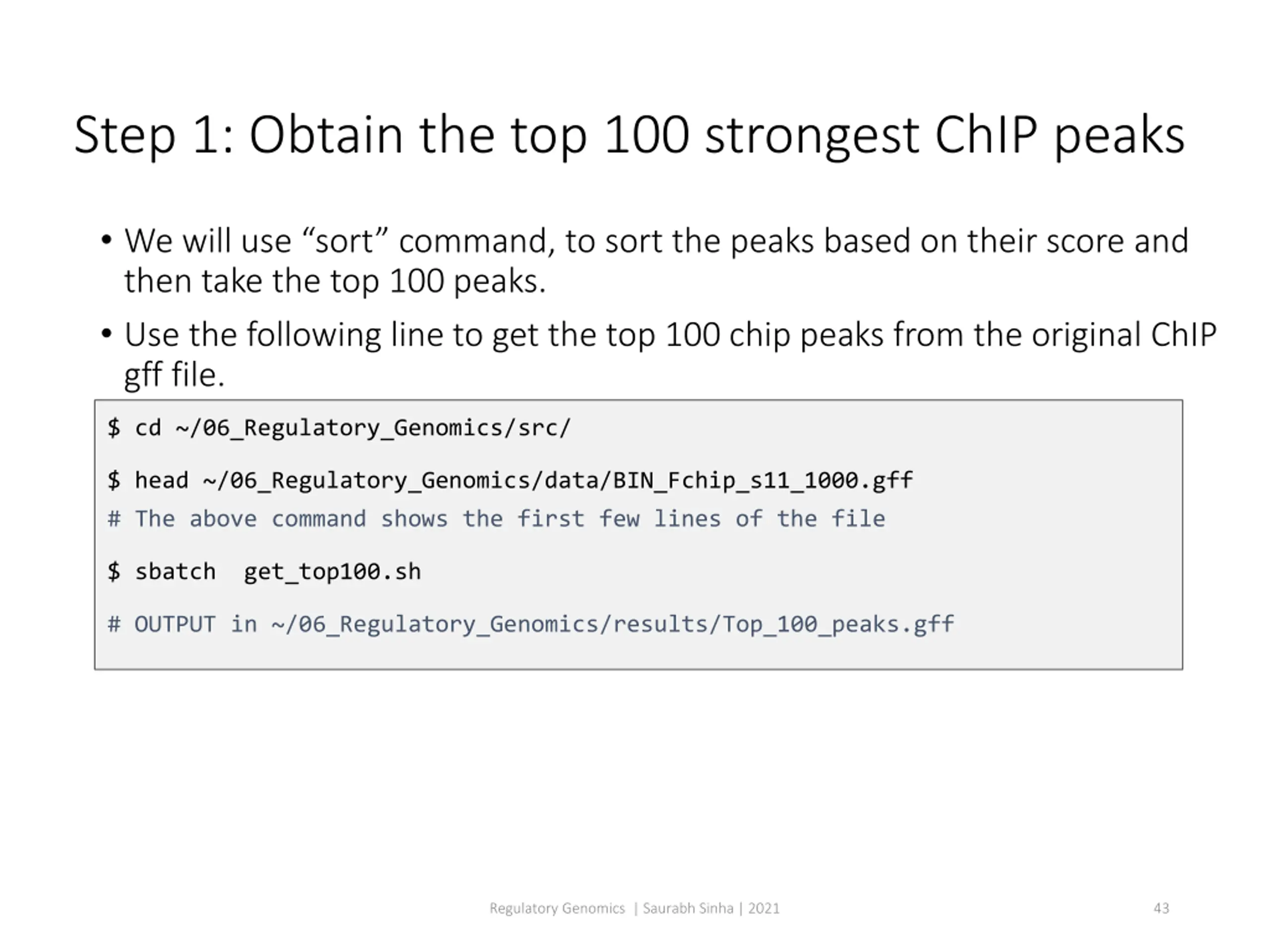Step 1: Obtain the top 100 strongest ChIP peaks We will use sort command, to sort the peaks based on their score and then take the top 100 peaks. Use the following line to get the top 100 chip peaks from the original ChIP gff file. $ cd ~/06_Regulatory_Genomics/src/ $ head ~/06_Regulatory_Genomics/data/BIN_Fchip_s11_1000.gff # The above command shows the first few lines of the file $ sbatch get_top100.sh # OUTPUT in ~/06_Regulatory_Genomics/results/Top_100_peaks.gff Regulatory Genomics | Saurabh Sinha | 2021 43