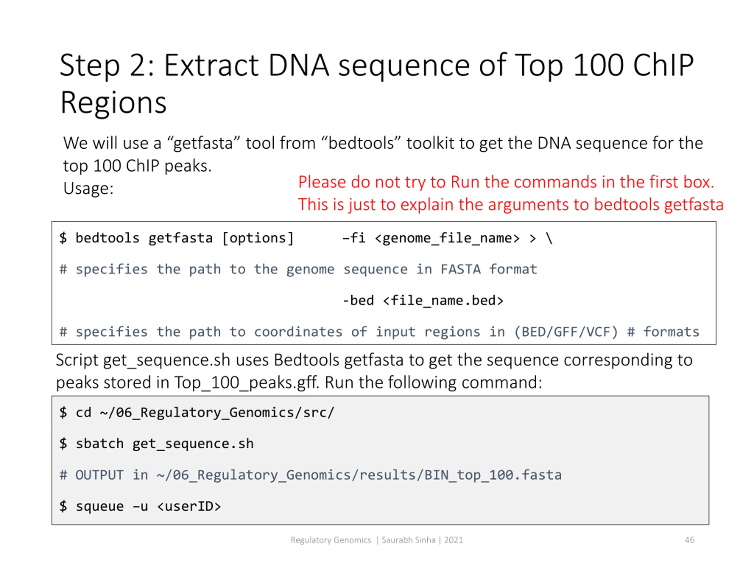 Step 2: Extract DNA sequence of Top 100 ChIP Regions We will use a getfasta tool from bedtools toolkit to get the DNA sequence for the top 100 ChIP peaks. Usage: Please do not try to Run the commands in the first box. This is just to explain the arguments to bedtools getfasta $ bedtools getfasta [options] fi <genome_file_name> > \ # specifies the path to the genome sequence in FASTA format -bed <file_name.bed> # specifies the path to coordinates of input regions in (BED/GFF/VCF) # formats Script get_sequence.sh uses Bedtools getfasta to get the sequence corresponding to peaks stored in Top_100_peaks.gff. Run the following command: $ cd ~/06_Regulatory_Genomics/src/ $ sbatch get_sequence.sh # OUTPUT in ~/06_Regulatory_Genomics/results/BIN_top_100.fasta $ squeue u <userID> Regulatory Genomics | Saurabh Sinha | 2021 46