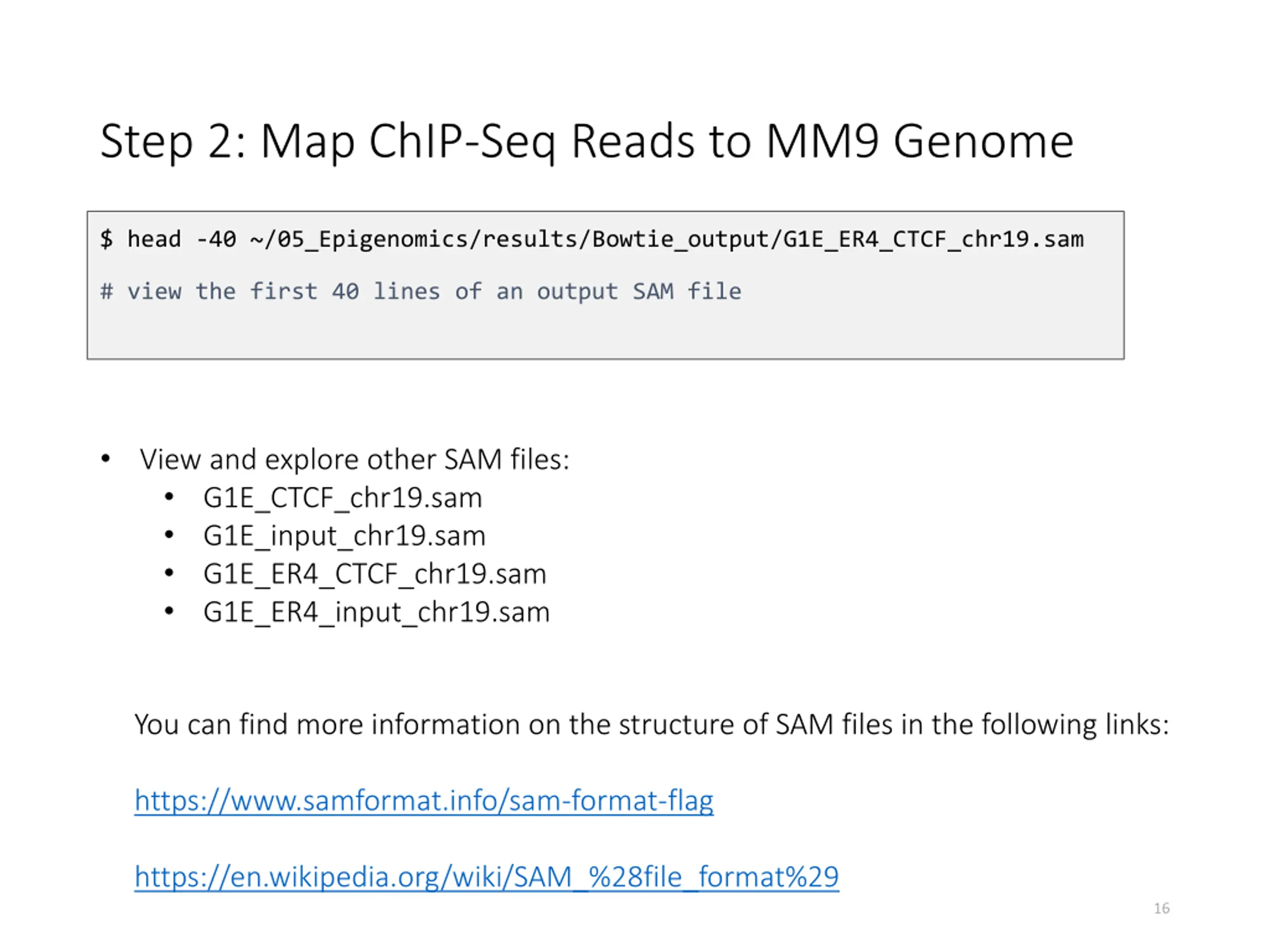 Step 2: Map ChIP-Seq Reads to MM9 Genome $ head -40 ~/05_Epigenomics/results/Bowtie_output/G1E_ER4_CTCF_chr19.sam # view the first 40 lines of an output SAM file View and explore other SAM files: G1E_CTCF_chr19.sam G1E_input_chr19.sam G1E_ER4_CTCF_chr19.sam G1E_ER4_input_chr19.sam You can find more information on the structure of SAM files in the following links: https://www.samformat.info/sam-format-flag https://en.wikipedia.org/wiki/SAM_%28file_format%29 16