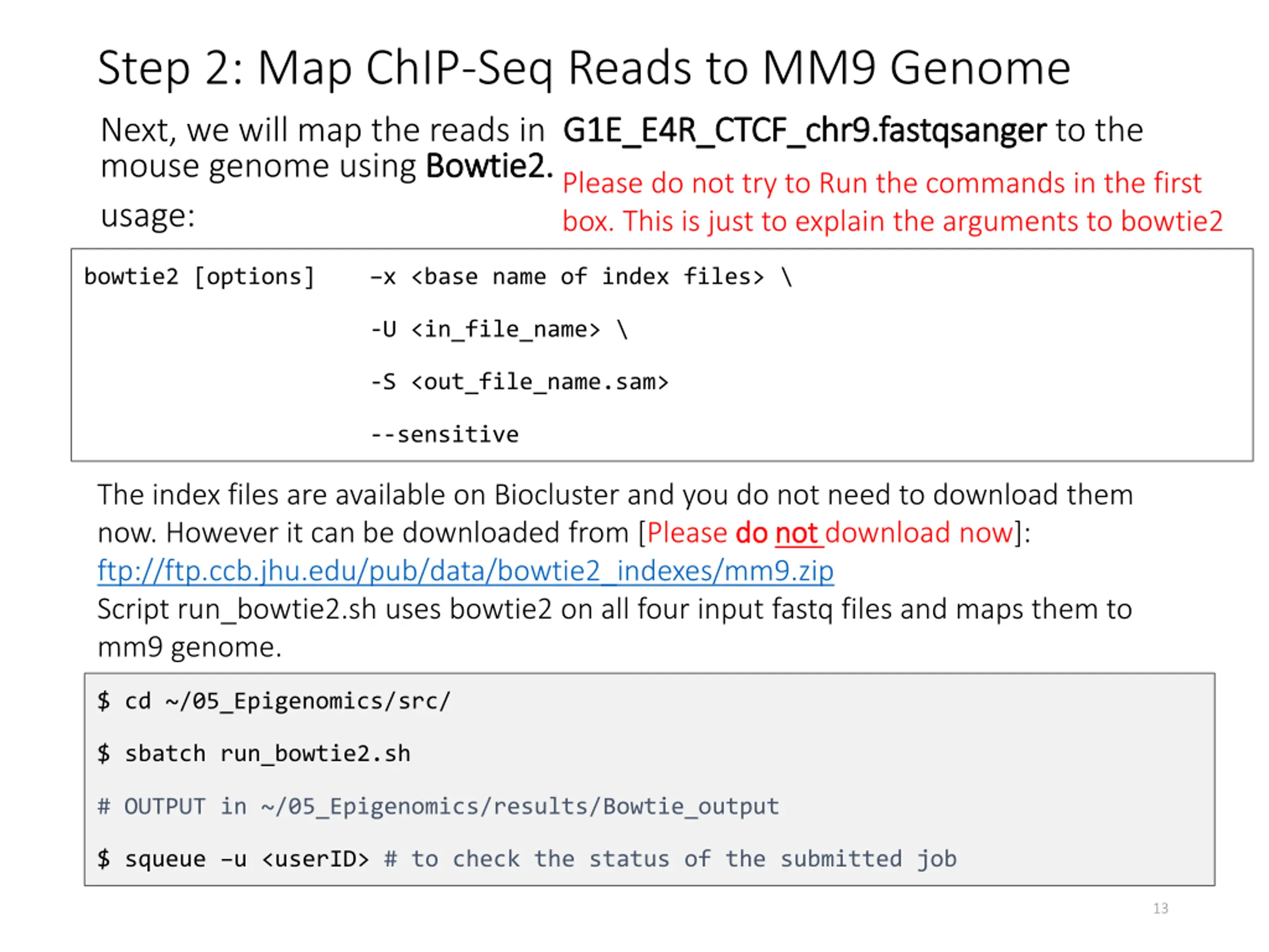 Step 2: Map ChIP-Seq Reads to MM9 Genome Next, we will map the reads in G1E_E4R_CTCF_chr9.fastqsanger G1E_E4R_CTCF_chr9.fastqsanger to the mouse genome using Bowtie2. Bowtie2. usage: box. This is just to explain the arguments to bowtie2 Please do not try to Run the commands in the first bowtie2 [options] x <base name of index files> \ -U <in_file_name> \ -S <out_file_name.sam> --sensitive The index files are available on Biocluster and you do not need to download them now. However it can be downloaded from [Please do ftp://ftp.ccb.jhu.edu/pub/data/bowtie2_indexes/mm9.zip Script run_bowtie2.sh uses bowtie2 on all four input fastq files and maps them to mm9 genome. do not not download now]: $ cd ~/05_Epigenomics/src/ $ sbatch run_bowtie2.sh # OUTPUT in ~/05_Epigenomics/results/Bowtie_output $ squeue u <userID> # to check the status of the submitted job 13