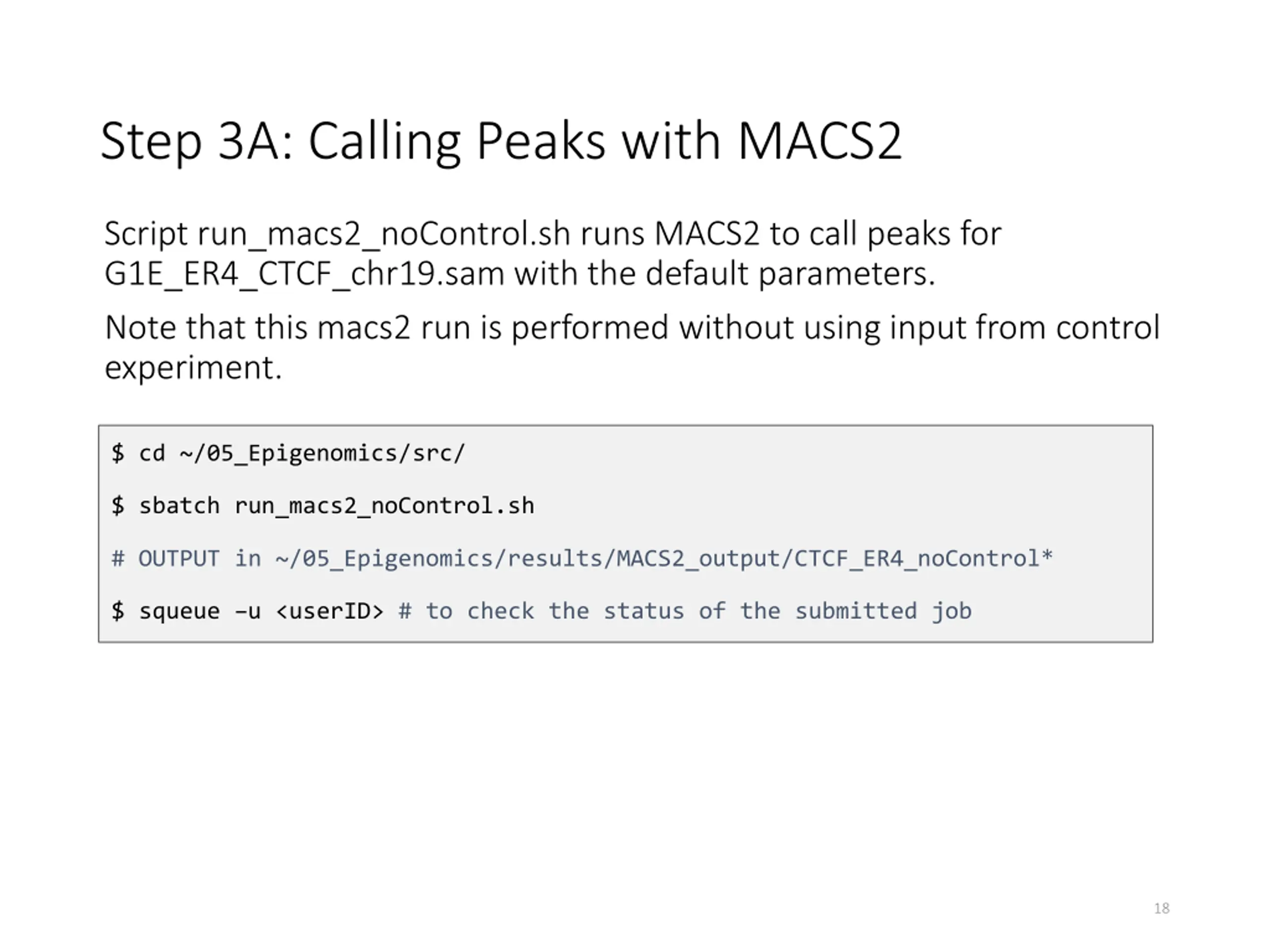Step 3A: Calling Peaks with MACS2 Script run_macs2_noControl.sh runs MACS2 to call peaks for G1E_ER4_CTCF_chr19.sam with the default parameters. Note that this macs2 run is performed without using input from control experiment. $ cd ~/05_Epigenomics/src/ $ sbatch run_macs2_noControl.sh # OUTPUT in ~/05_Epigenomics/results/MACS2_output/CTCF_ER4_noControl* $ squeue u <userID> # to check the status of the submitted job 18