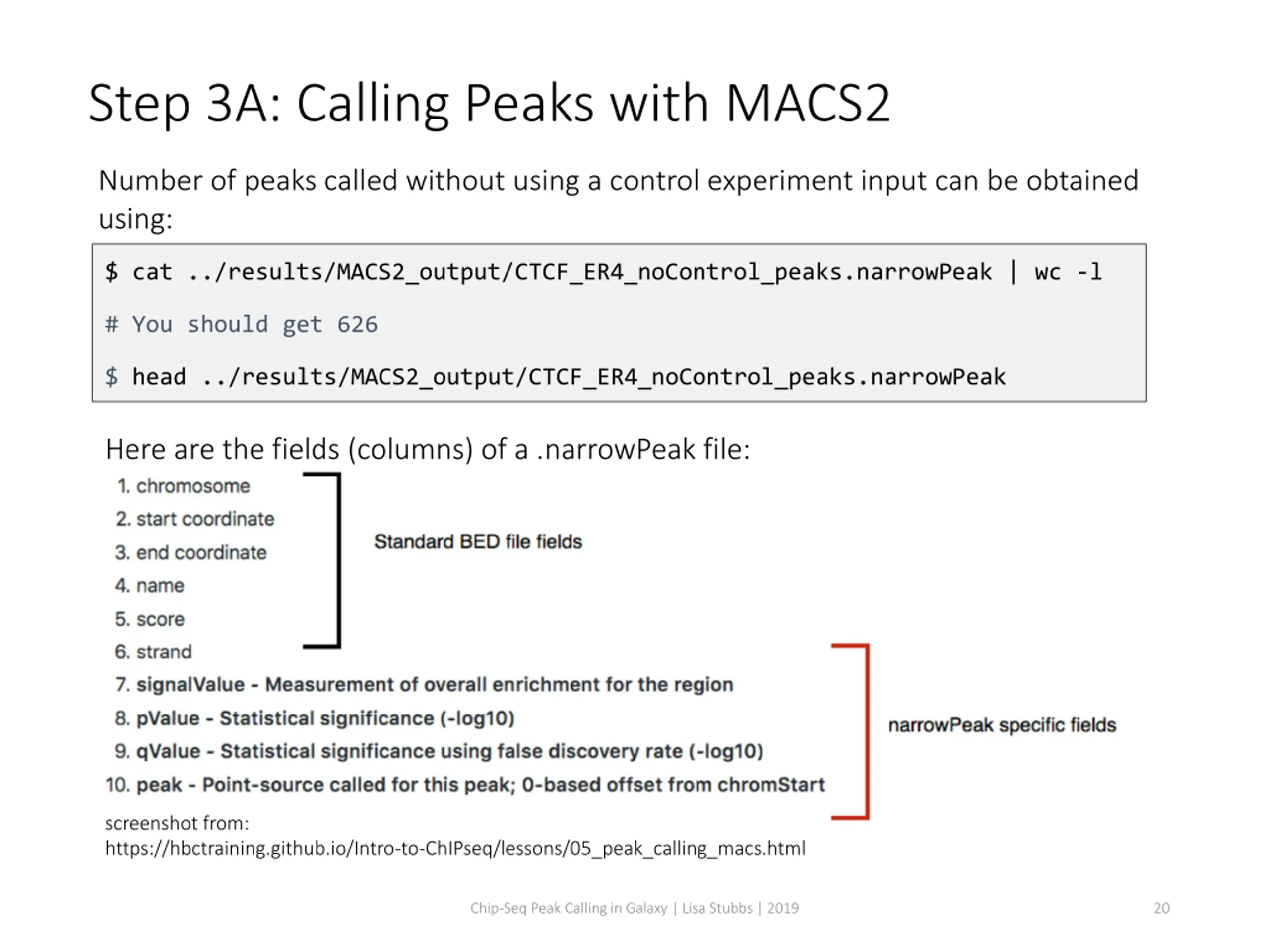 Step 3A: Calling Peaks with MACS2 Number of peaks called without using a control experiment input can be obtained using: $ cat ../results/MACS2_output/CTCF_ER4_noControl_peaks.narrowPeak | wc -l # You should get 626 $ head ../results/MACS2_output/CTCF_ER4_noControl_peaks.narrowPeak Here are the fields (columns) of a .narrowPeak file: screenshot from: https://hbctraining.github.io/Intro-to-ChIPseq/lessons/05_peak_calling_macs.html Chip-Seq Peak Calling in Galaxy | Lisa Stubbs | 2019 20