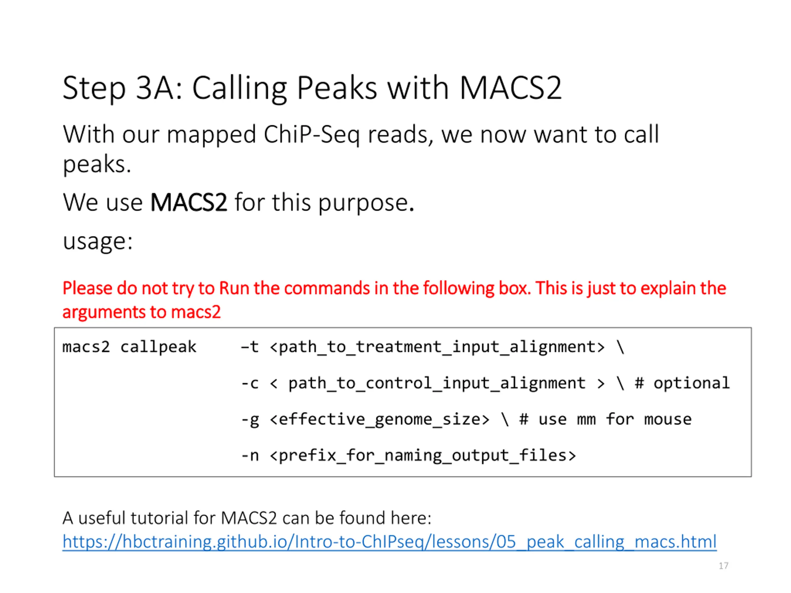 Step 3A: Calling Peaks with MACS2 With our mapped ChiP-Seq reads, we now want to call peaks. We use MACS2 MACS2 for this purpose. . usage: Please do not try to Run the commands in the following box. This is just to explain the Please do not try to Run the commands in the following box. This is just to explain the arguments to macs2 arguments to macs2 macs2 callpeak t <path_to_treatment_input_alignment> \ -c < path_to_control_input_alignment > \ # optional -g <effective_genome_size> \ # use mm for mouse -n <prefix_for_naming_output_files> A useful tutorial for MACS2 can be found here: https://hbctraining.github.io/Intro-to-ChIPseq/lessons/05_peak_calling_macs.html 17