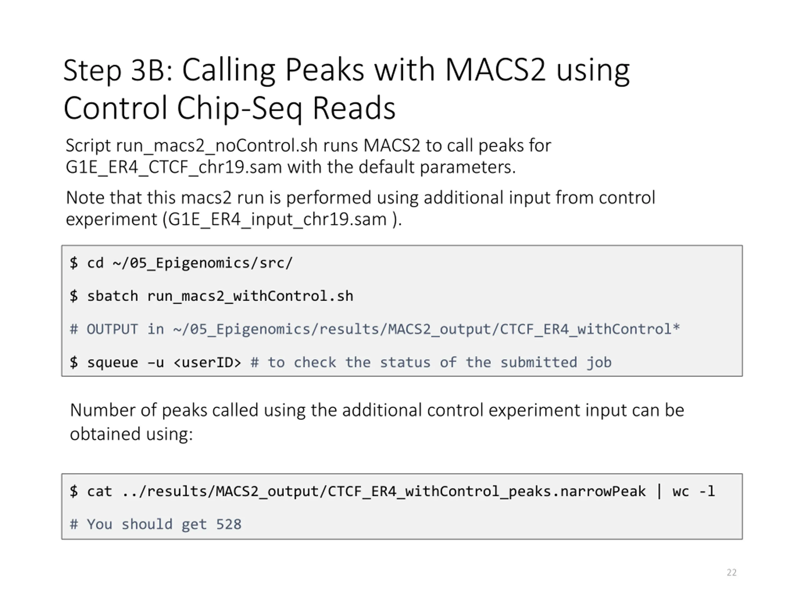 Step 3B: Calling Peaks with MACS2 using Control Chip-Seq Reads Script run_macs2_noControl.sh runs MACS2 to call peaks for G1E_ER4_CTCF_chr19.sam with the default parameters. Note that this macs2 run is performed using additional input from control experiment (G1E_ER4_input_chr19.sam ). $ cd ~/05_Epigenomics/src/ $ sbatch run_macs2_withControl.sh # OUTPUT in ~/05_Epigenomics/results/MACS2_output/CTCF_ER4_withControl* $ squeue u <userID> # to check the status of the submitted job Number of peaks called using the additional control experiment input can be obtained using: $ cat ../results/MACS2_output/CTCF_ER4_withControl_peaks.narrowPeak | wc -l # You should get 528 22
