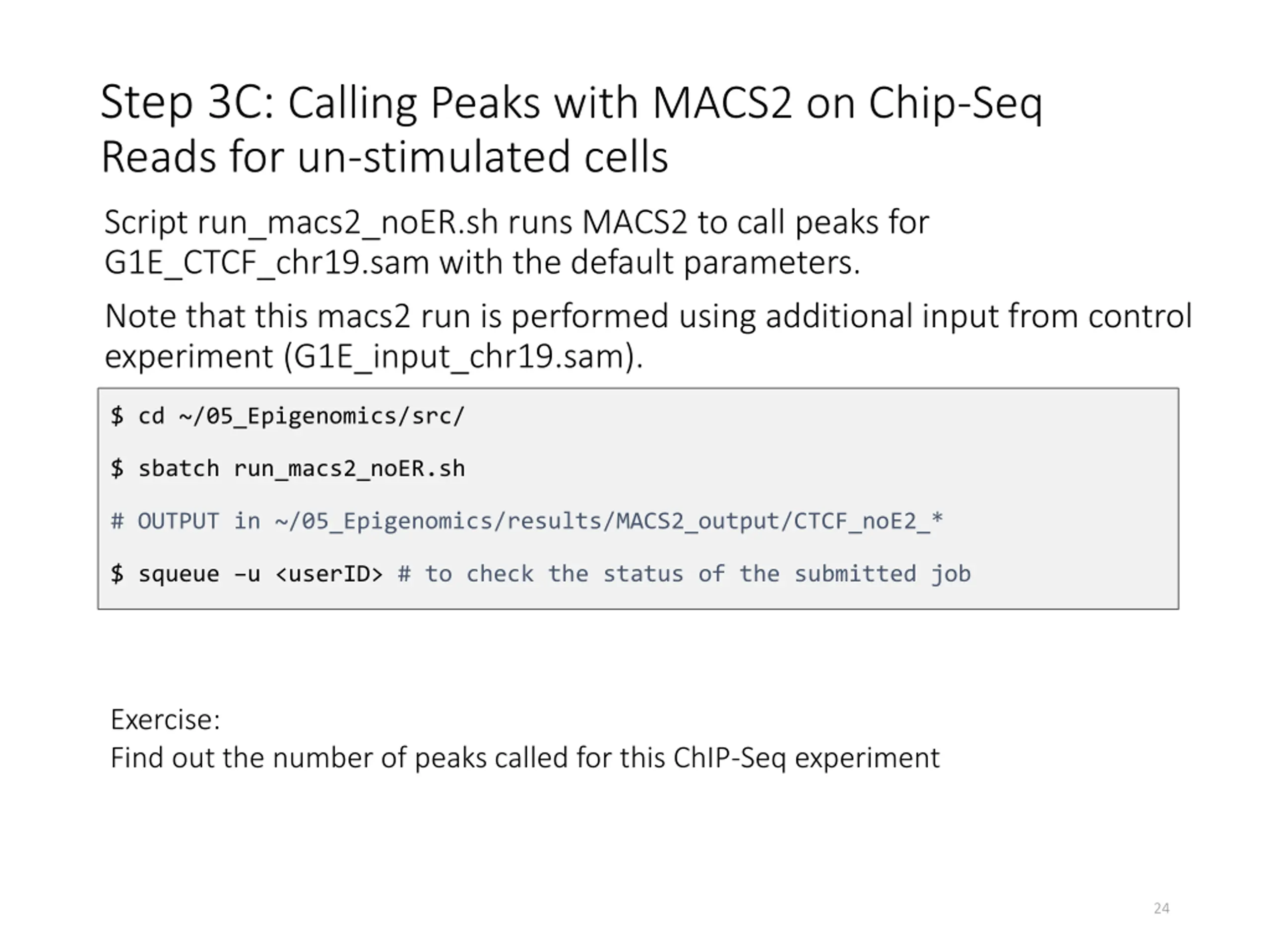 Step 3C: Calling Peaks with MACS2 on Chip-Seq Reads for un-stimulated cells Script run_macs2_noER.sh runs MACS2 to call peaks for G1E_CTCF_chr19.sam with the default parameters. Note that this macs2 run is performed using additional input from control experiment (G1E_input_chr19.sam). $ cd ~/05_Epigenomics/src/ $ sbatch run_macs2_noER.sh # OUTPUT in ~/05_Epigenomics/results/MACS2_output/CTCF_noE2_* $ squeue u <userID> # to check the status of the submitted job Exercise: Find out the number of peaks called for this ChIP-Seq experiment 24