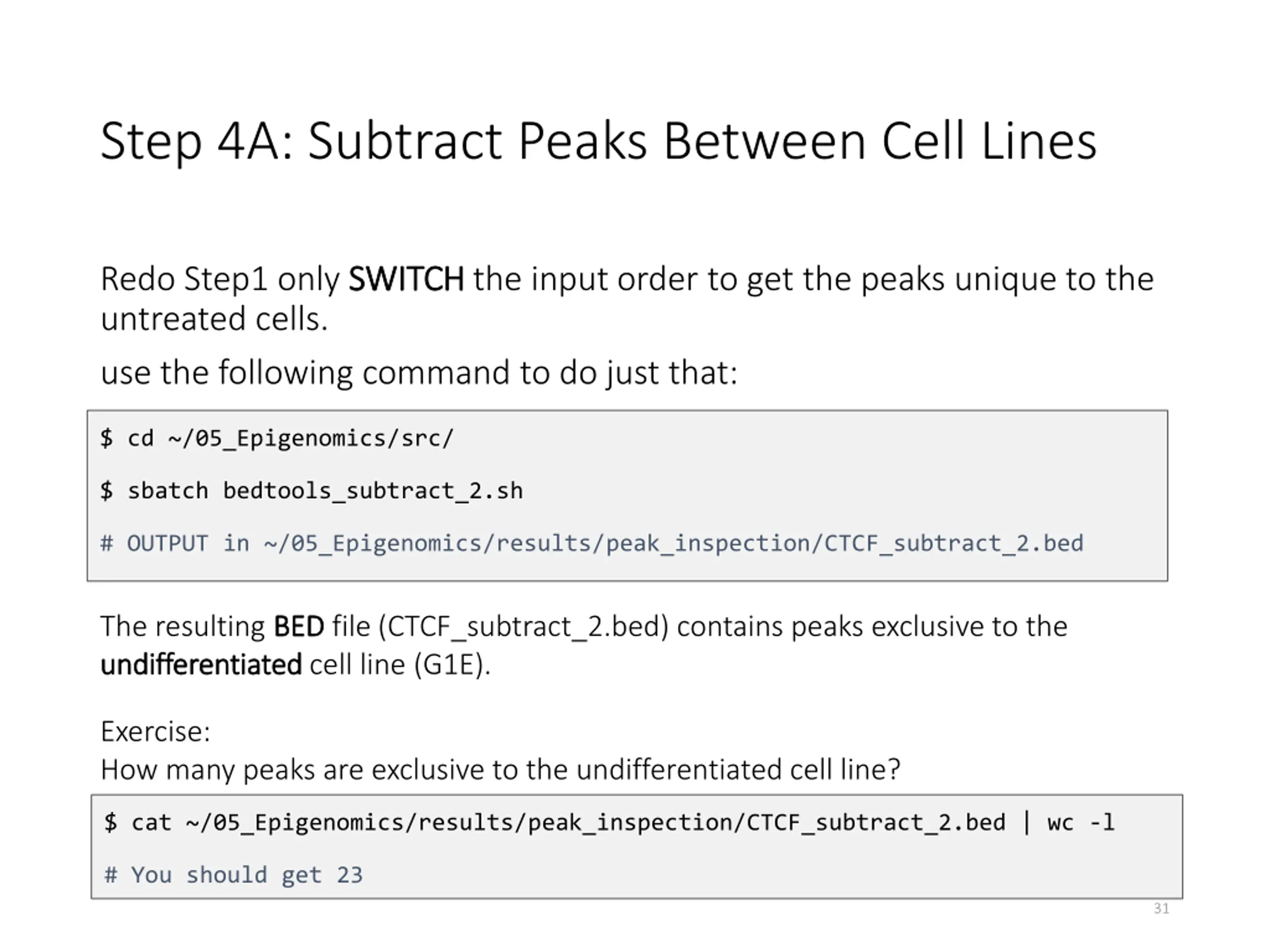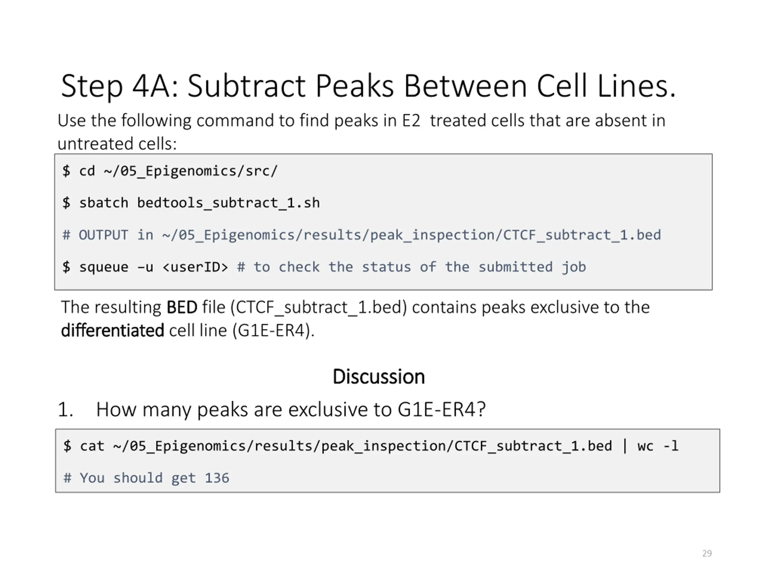 Step 4A: Subtract Peaks Between Cell Lines. Use the following command to find peaks in E2 treated cells that are absent in untreated cells: $ cd ~/05_Epigenomics/src/ $ sbatch bedtools_subtract_1.sh # OUTPUT in ~/05_Epigenomics/results/peak_inspection/CTCF_subtract_1.bed $ squeue u <userID> # to check the status of the submitted job The resulting BED differentiated differentiated cell line (G1E-ER4). BED file (CTCF_subtract_1.bed) contains peaks exclusive to the Discussion Discussion 1. How many peaks are exclusive to G1E-ER4? $ cat ~/05_Epigenomics/results/peak_inspection/CTCF_subtract_1.bed | wc -l # You should get 136 29