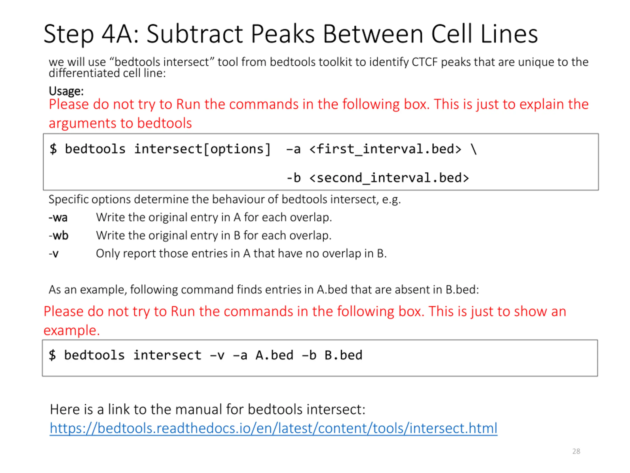 Step 4A: Subtract Peaks Between Cell Lines we will use bedtools intersect tool from bedtools toolkit to identify CTCF peaks that are unique to the differentiated cell line: Usage: Usage: Please do not try to Run the commands in the following box. This is just to explain the arguments to bedtools $ bedtools intersect[options] a <first_interval.bed> \ -b <second_interval.bed> Specific options determine the behaviour of bedtools intersect, e.g. - -wa wa Write the original entry in A for each overlap. -wb wb Write the original entry in B for each overlap. -v v Only report those entries in A that have no overlap in B. As an example, following command finds entries in A.bed that are absent in B.bed: Please do not try to Run the commands in the following box. This is just to show an example. $ bedtools intersect v a A.bed b B.bed Here is a link to the manual for bedtools intersect: https://bedtools.readthedocs.io/en/latest/content/tools/intersect.html 28