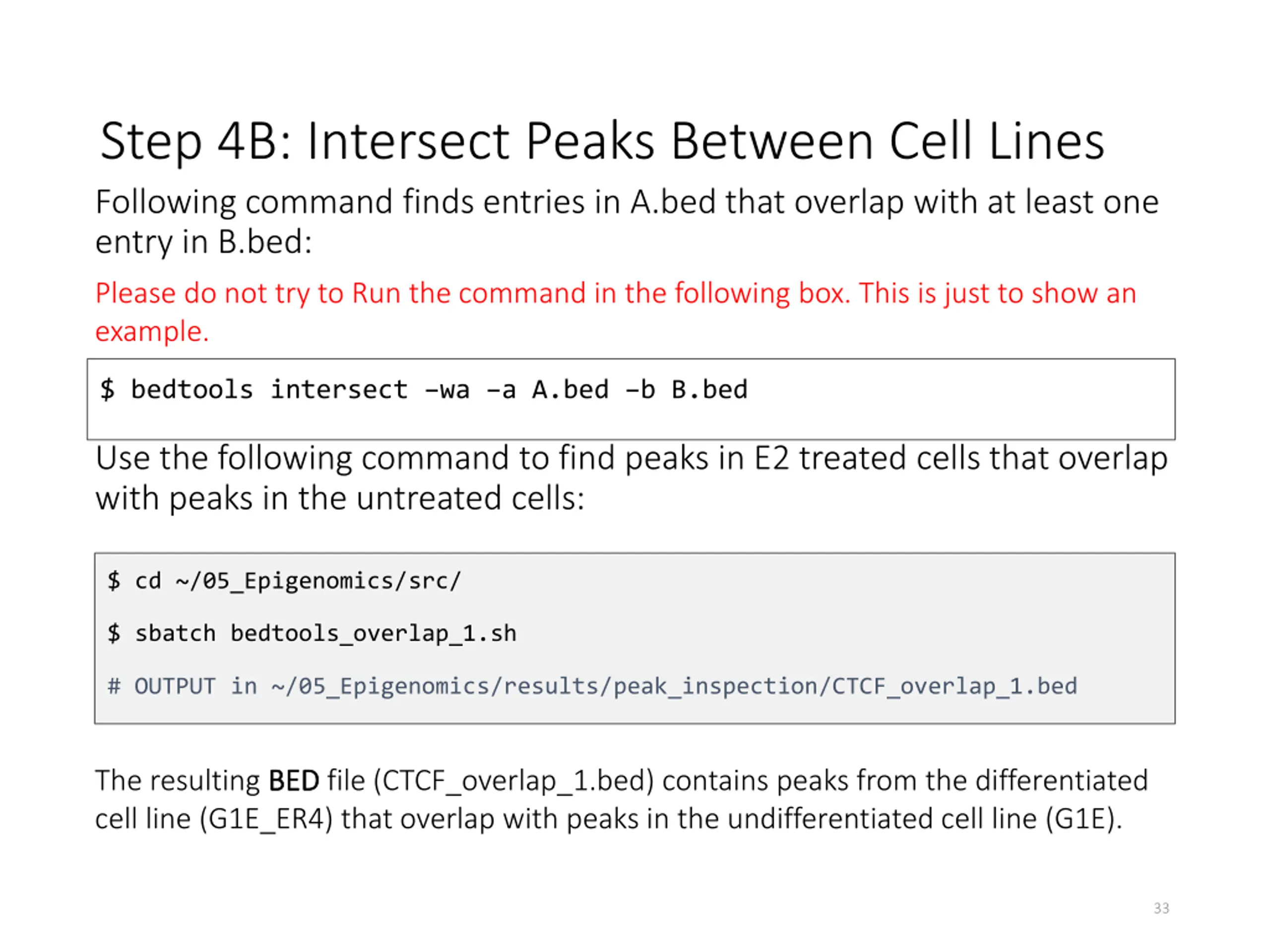 Step 4B: Intersect Peaks Between Cell Lines Following command finds entries in A.bed that overlap with at least one entry in B.bed: Please do not try to Run the command in the following box. This is just to show an example. $ bedtools intersect wa a A.bed b B.bed Use the following command to find peaks in E2 treated cells that overlap with peaks in the untreated cells: $ cd ~/05_Epigenomics/src/ $ sbatch bedtools_overlap_1.sh # OUTPUT in ~/05_Epigenomics/results/peak_inspection/CTCF_overlap_1.bed The resulting BED cell line (G1E_ER4) that overlap with peaks in the undifferentiated cell line (G1E). BED file (CTCF_overlap_1.bed) contains peaks from the differentiated 33