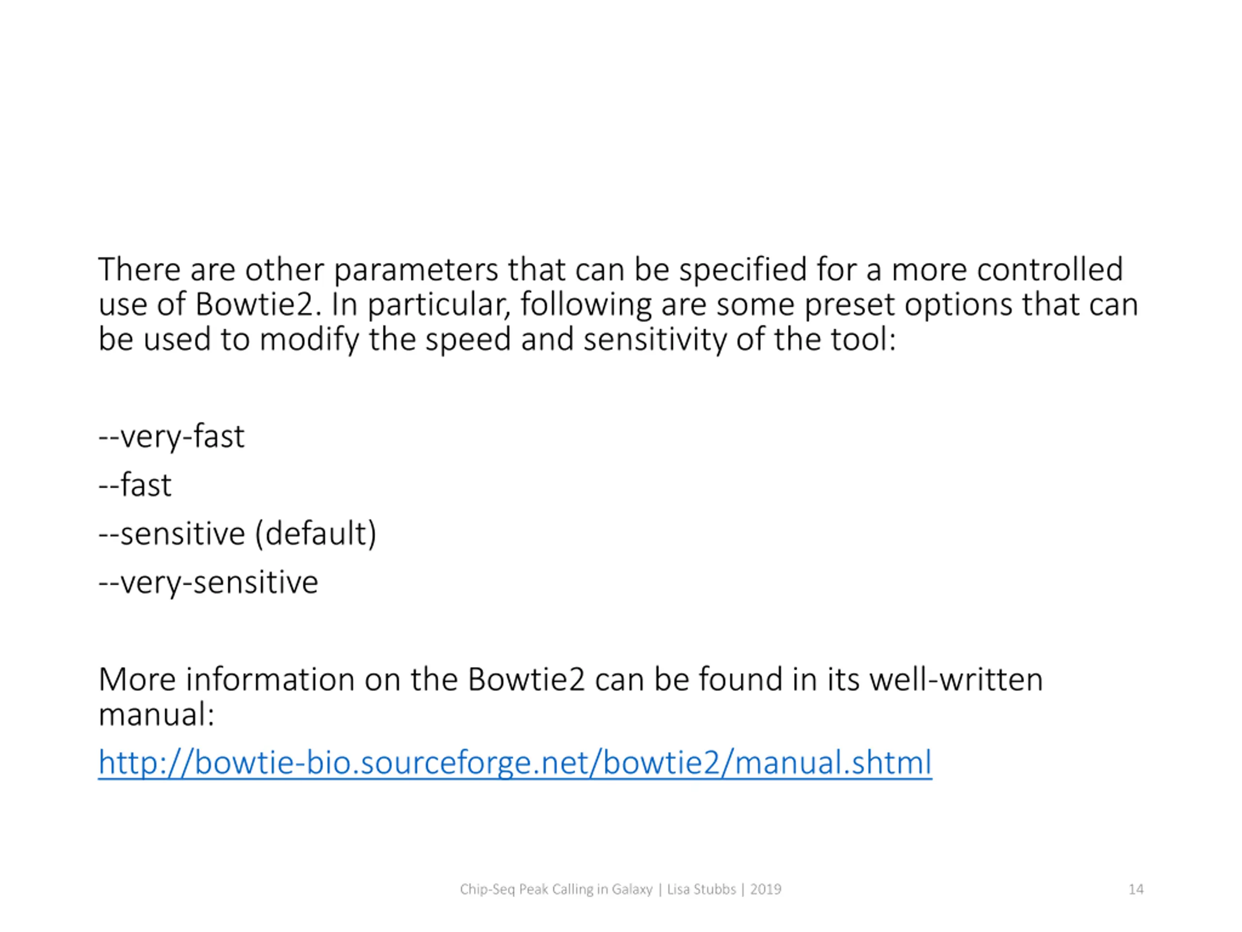 There are other parameters that can be specified for a more controlled use of Bowtie2. In particular, following are some preset options that can be used to modify the speed and sensitivity of the tool: --very-fast --fast --sensitive (default) --very-sensitive More information on the Bowtie2 can be found in its well-written manual: http://bowtie-bio.sourceforge.net/bowtie2/manual.shtml Chip-Seq Peak Calling in Galaxy | Lisa Stubbs | 2019 14