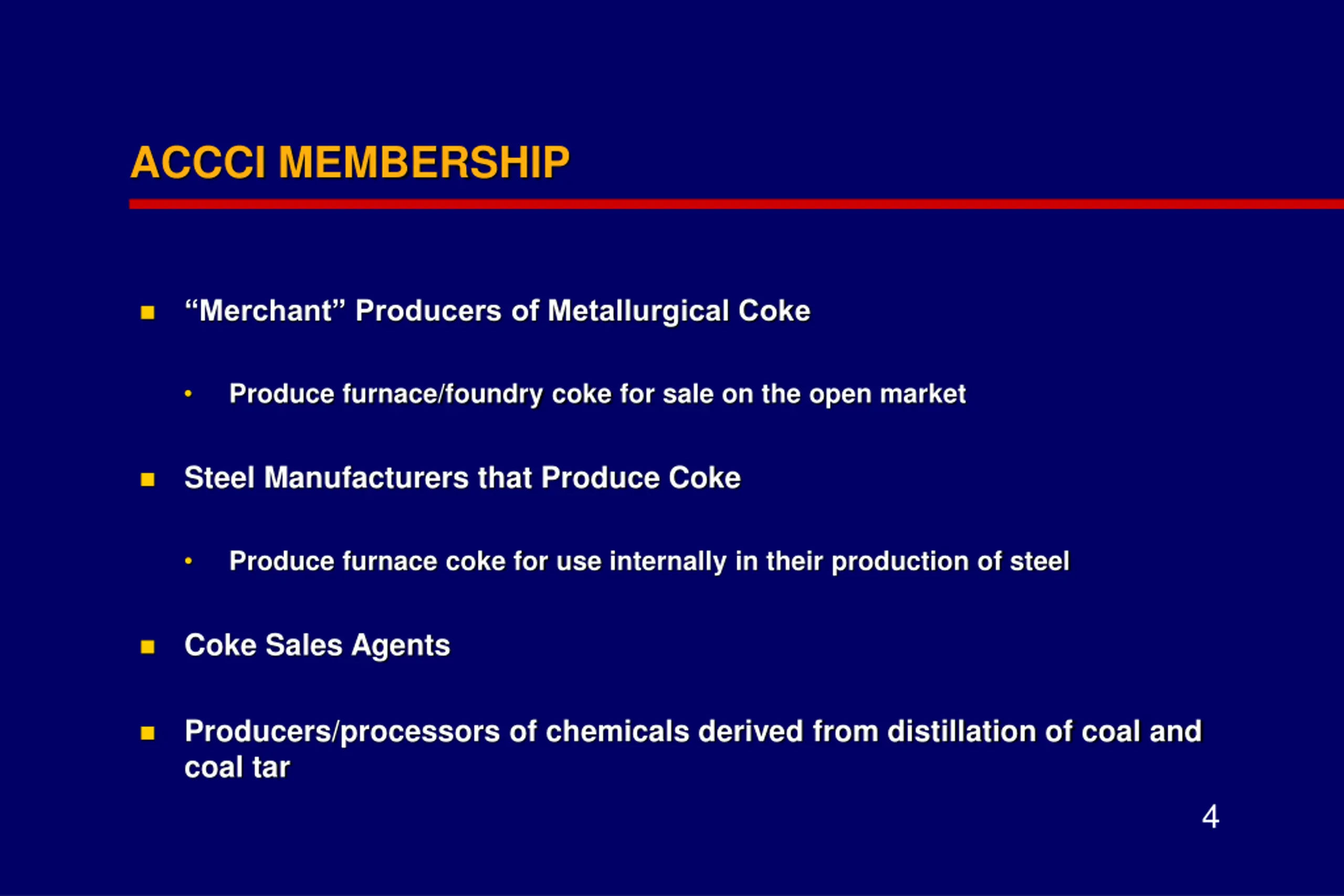 OVERVIEW OF ACCCI The American Coke and Coal Chemicals Institute (ACCCI) was formed in 1944 by companies interested in establishing a forum to discuss and act upon issues of common concern to the metallurgical coke and coal chemicals industry. Today, ACCCI members represent over 95% of the metallurgical coke produced in the U.S. and Canada, including both merchant coke producers and integrated steel companies with coke production capacity, and 100% of companies producing coal chemicals in the U.S. and Canada. ACCCI s function is to advance the interests of the metallurgical coke and coal chemicals industry by communicating industry positions to members of Congress and Federal regulatory officials; cooperating with governmental agencies having jurisdiction over the industry; providing a forum for the exchange of information and discussion of issues; collecting statistics related to the industry; and, promoting the use of coke and its byproducts in the marketplace. 3