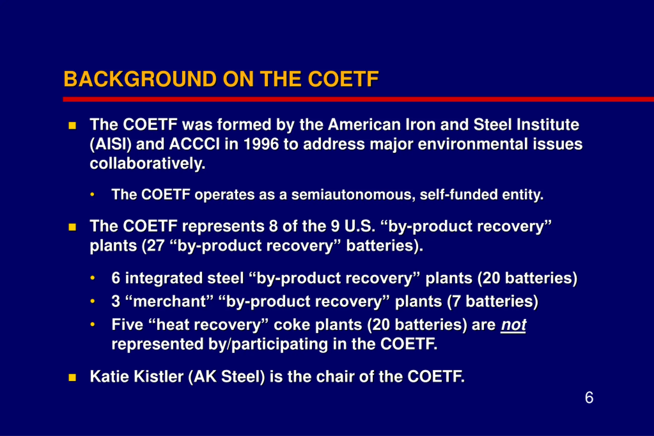 BACKGROUND ON THE COETF The COETF was formed by the American Iron and Steel Institute (AISI) and ACCCI in 1996 to address major environmental issues collaboratively. The COETF operates as a semiautonomous, self-funded entity. The COETF represents 8 of the 9 U.S. by-product recovery plants (27 by-product recovery batteries). 6 integrated steel by-product recovery plants (20 batteries) 3 merchant by-product recovery plants (7 batteries) Five heat recovery coke plants (20 batteries) are not represented by/participating in the COETF. Katie Kistler (AK Steel) is the chair of the COETF. 6