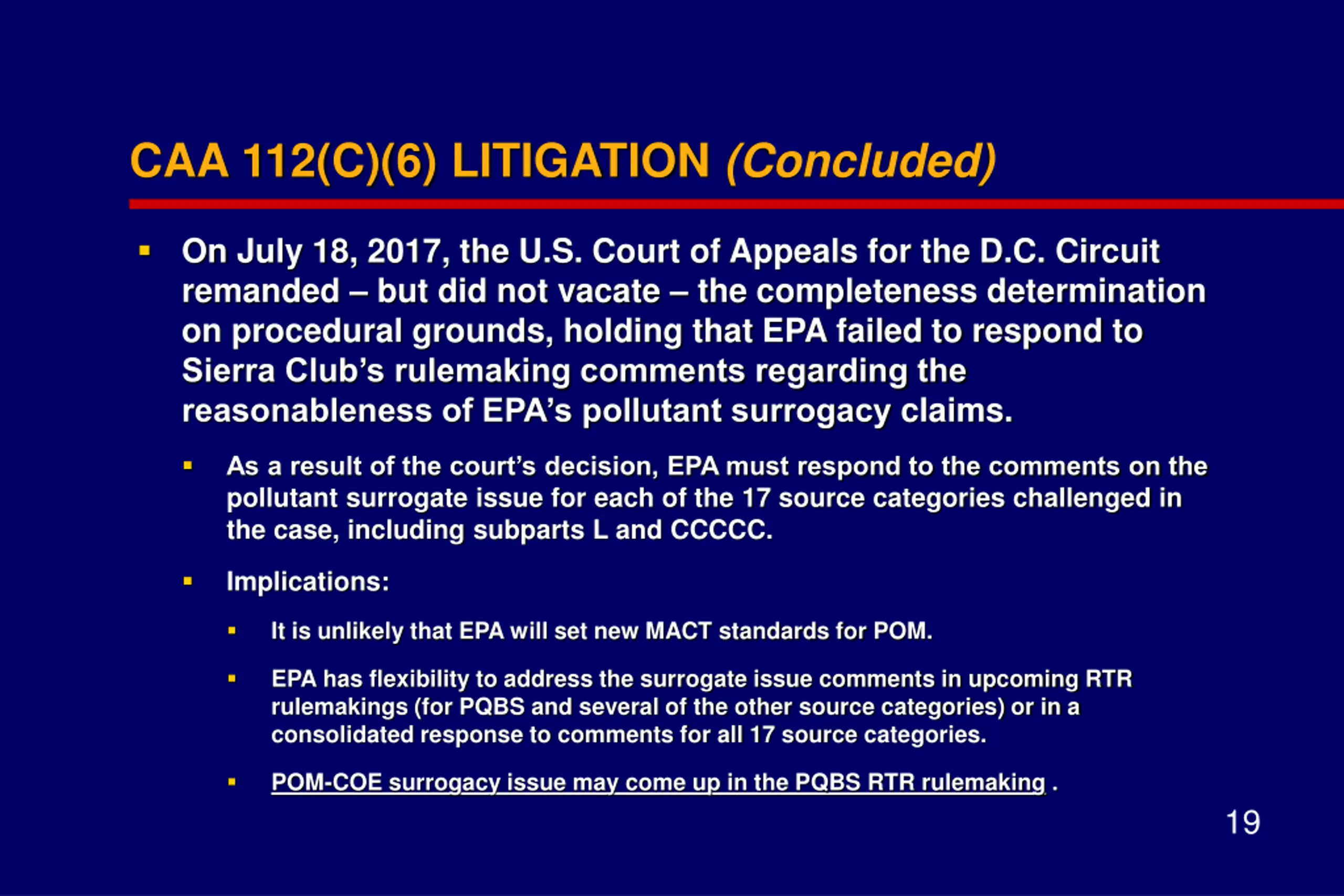 CAA 112(C)(6) LITIGATION (Concluded) On July 18, 2017, the U.S. Court of Appeals for the D.C. Circuit remanded but did not vacate the completeness determination on procedural grounds, holding that EPA failed to respond to Sierra Club s rulemaking comments regarding the reasonableness of EPA s pollutant surrogacy claims. As a result of the court s decision, EPA must respond to the comments on the pollutant surrogate issue for each of the 17 source categories challenged in the case, including subparts L and CCCCC. Implications: It is unlikely that EPA will set new MACT standards for POM. EPA has flexibility to address the surrogate issue comments in upcoming RTR rulemakings (for PQBS and several of the other source categories) or in a consolidated response to comments for all 17 source categories. POM-COE surrogacy issue may come up in the PQBS RTR rulemaking . 19