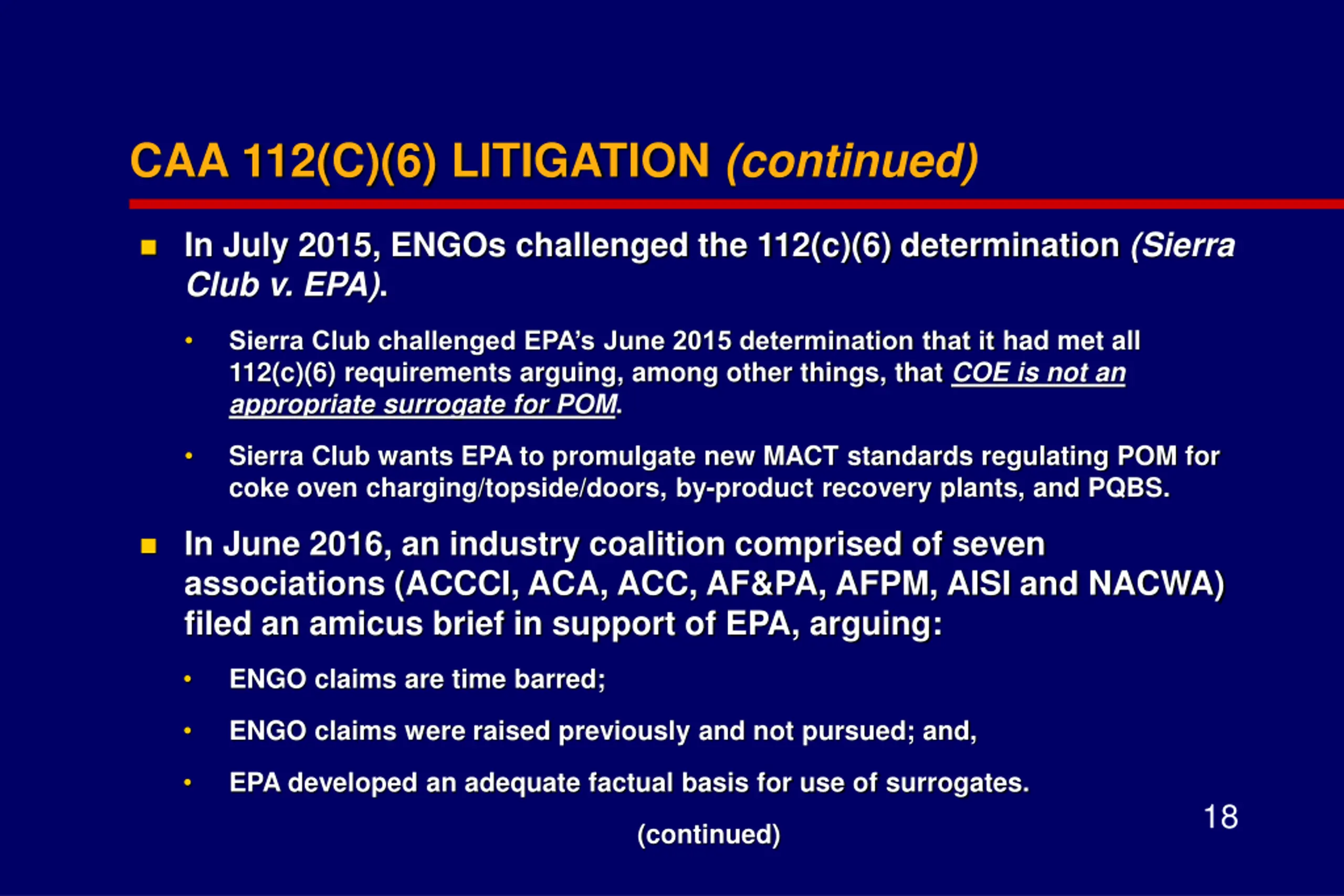 CAA 112(C)(6) LITIGATION (continued) In July 2015, ENGOs challenged the 112(c)(6) determination (Sierra Club v. EPA). Sierra Club challenged EPA s June 2015 determination that it had met all 112(c)(6) requirements arguing, among other things, that COE is not an appropriate surrogate for POM. Sierra Club wants EPA to promulgate new MACT standards regulating POM for coke oven charging/topside/doors, by-product recovery plants, and PQBS. In June 2016, an industry coalition comprised of seven associations (ACCCI, ACA, ACC, AF&PA, AFPM, AISI and NACWA) filed an amicus brief in support of EPA, arguing: ENGO claims are time barred; ENGO claims were raised previously and not pursued; and, EPA developed an adequate factual basis for use of surrogates. 18 (continued)