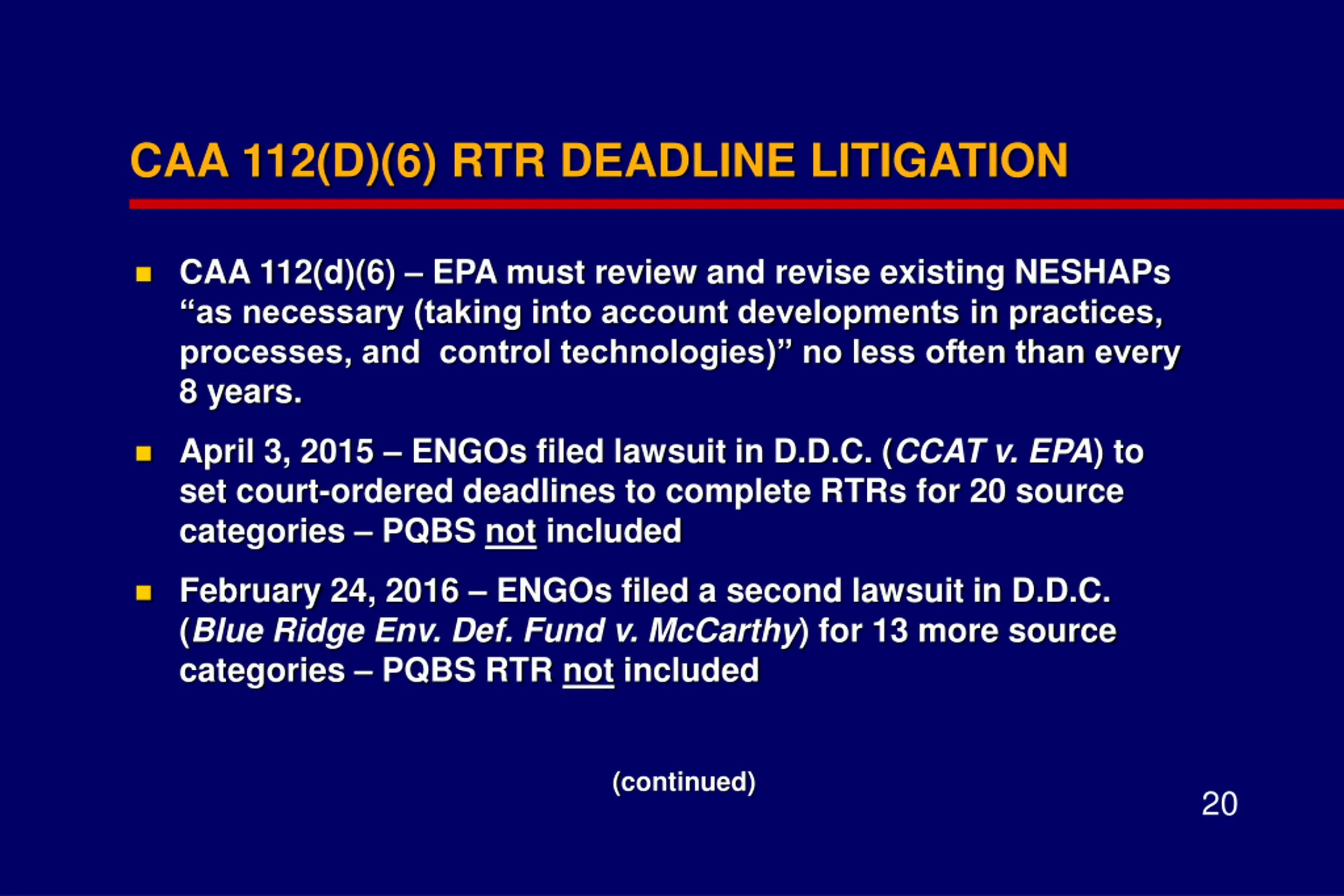 CAA 112(D)(6) RTR DEADLINE LITIGATION CAA 112(d)(6) EPA must review and revise existing NESHAPs as necessary (taking into account developments in practices, processes, and control technologies) no less often than every 8 years. April 3, 2015 ENGOs filed lawsuit in D.D.C. (CCAT v. EPA) to set court-ordered deadlines to complete RTRs for 20 source categories PQBS not included February 24, 2016 ENGOs filed a second lawsuit in D.D.C. (Blue Ridge Env. Def. Fund v. McCarthy) for 13 more source categories PQBS RTR not included (continued) 20