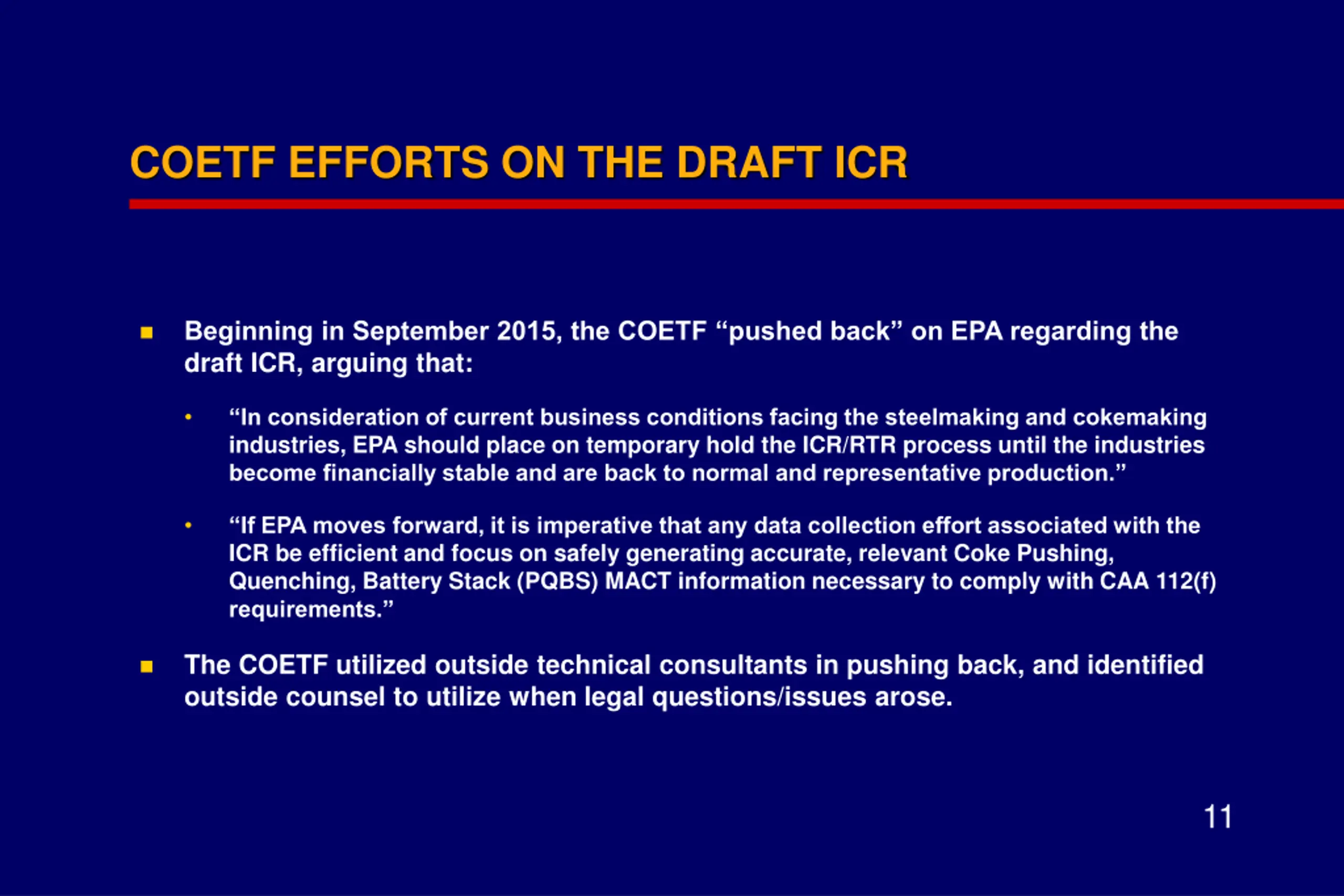 COETF EFFORTS ON THE DRAFT ICR Beginning in September 2015, the COETF pushed back on EPA regarding the draft ICR, arguing that: In consideration of current business conditions facing the steelmaking and cokemaking industries, EPA should place on temporary hold the ICR/RTR process until the industries become financially stable and are back to normal and representative production. If EPA moves forward, it is imperative that any data collection effort associated with the ICR be efficient and focus on safely generating accurate, relevant Coke Pushing, Quenching, Battery Stack (PQBS) MACT information necessary to comply with CAA 112(f) requirements. The COETF utilized outside technical consultants in pushing back, and identified outside counsel to utilize when legal questions/issues arose. 11