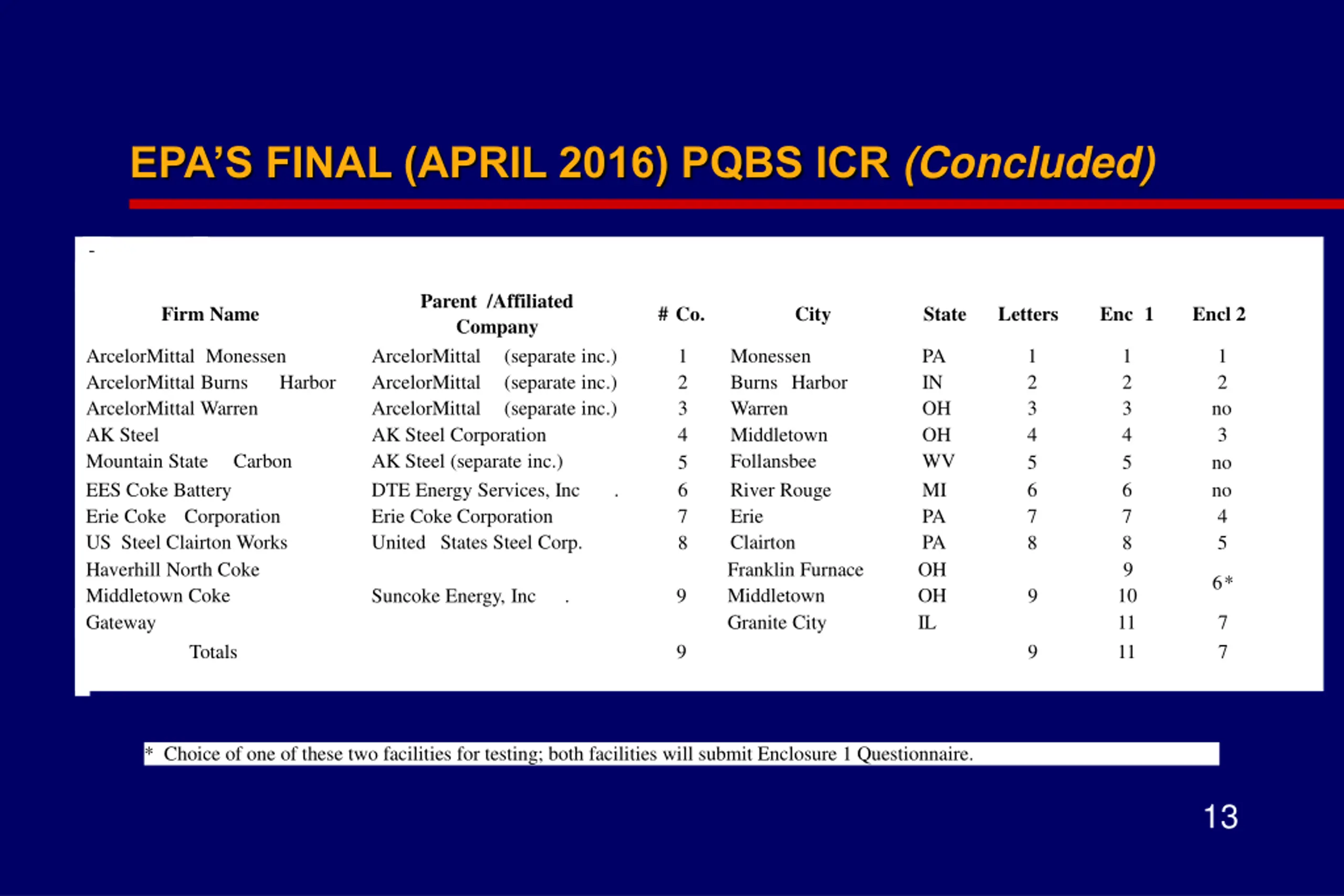 INITIAL EPA EFFORTS ON THE PQBS RTR In August 2015, EPA provided the COETF with a draft Information Collection Request (ICR) for comment. Enclosure 1: Questionnaire, which asked questions about the company and all of the operations at its coke plant(s) Enclosure 2: Testing request, which included all of the details of where and how to test From August 2015 through March 2016, the COETF engaged EPA on the draft ICR. 10