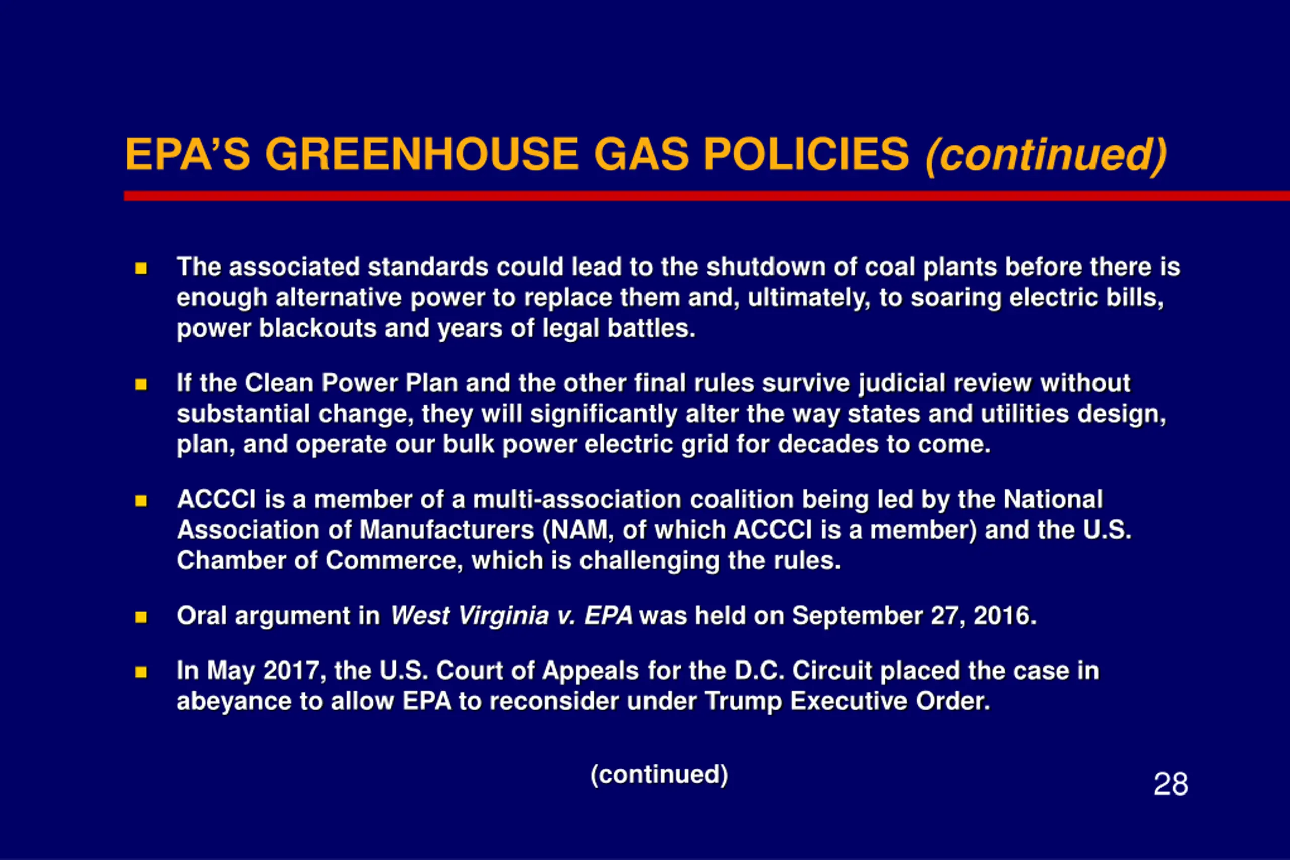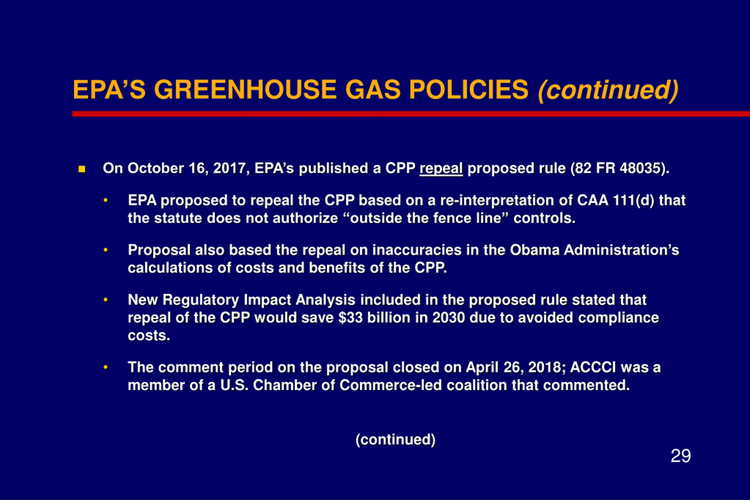 EPAS GREENHOUSE GAS POLICIES (continued) On October 16, 2017, EPA s published a CPP repeal proposed rule (82 FR 48035). EPA proposed to repeal the CPP based on a re-interpretation of CAA 111(d) that the statute does not authorize outside the fence line controls. Proposal also based the repeal on inaccuracies in the Obama Administration s calculations of costs and benefits of the CPP. New Regulatory Impact Analysis included in the proposed rule stated that repeal of the CPP would save $33 billion in 2030 due to avoided compliance costs. The comment period on the proposal closed on April 26, 2018; ACCCI was a member of a U.S. Chamber of Commerce-led coalition that commented. (continued) 29