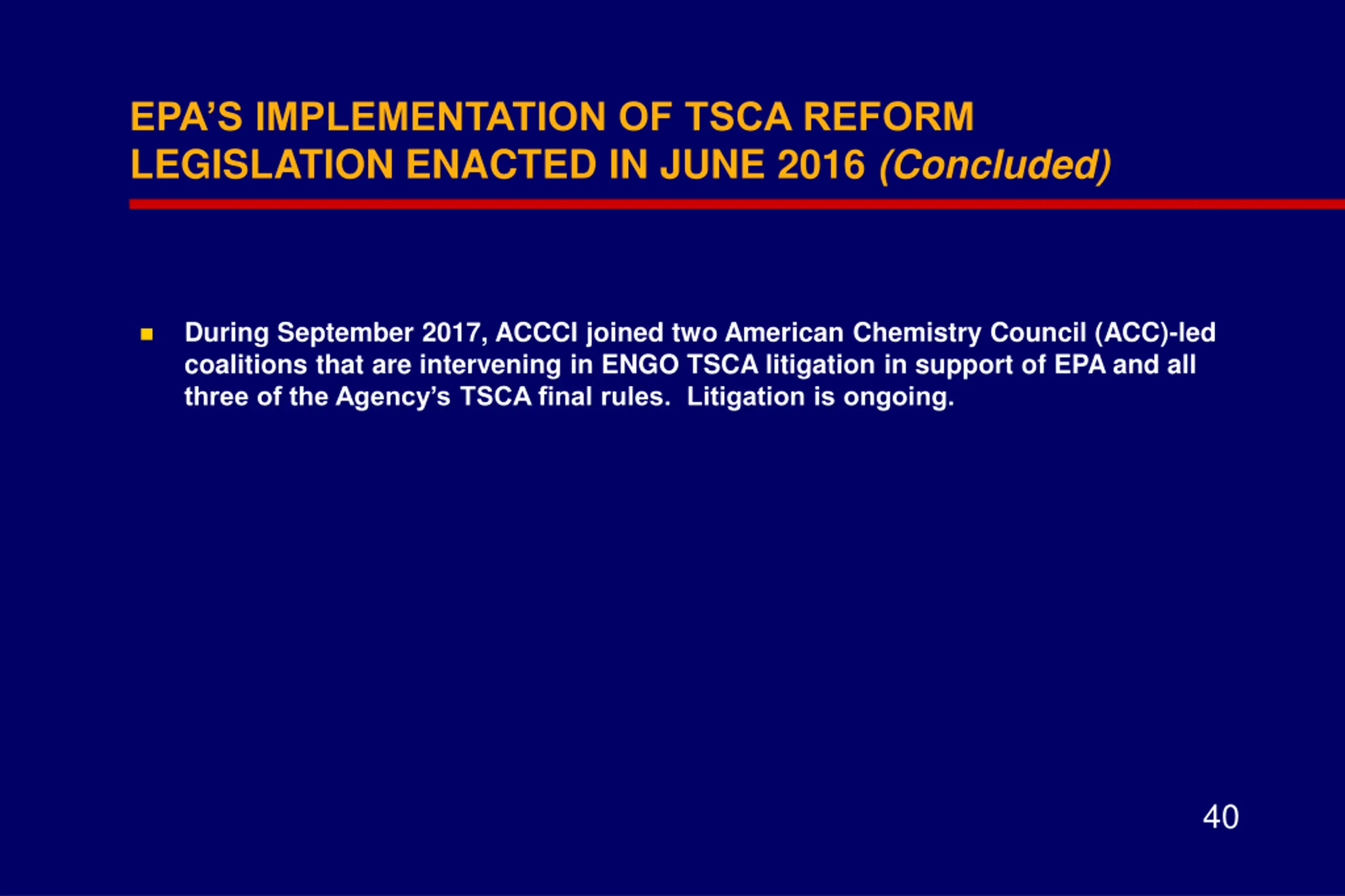 EPAS IMPLEMENTATION OF TSCA REFORM LEGISLATION ENACTED IN JUNE 2016 (Concluded) During September 2017, ACCCI joined two American Chemistry Council (ACC)-led coalitions that are intervening in ENGO TSCA litigation in support of EPA and all three of the Agency s TSCA final rules. Litigation is ongoing. 40