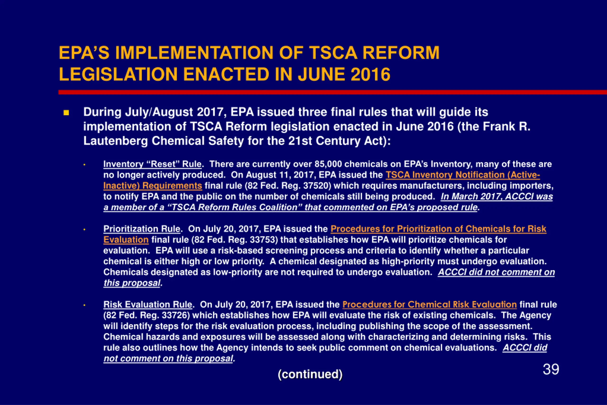 EPAS IMPLEMENTATION OF TSCA REFORM LEGISLATION ENACTED IN JUNE 2016 During July/August 2017, EPA issued three final rules that will guide its implementation of TSCA Reform legislation enacted in June 2016 (the Frank R. Lautenberg Chemical Safety for the 21st Century Act): Inventory Reset Rule. There are currently over 85,000 chemicals on EPA s Inventory, many of these are no longer actively produced. On August 11, 2017, EPA issued the TSCA Inventory Notification (Active- Inactive) Requirements final rule (82 Fed. Reg. 37520) which requires manufacturers, including importers, to notify EPA and the public on the number of chemicals still being produced. In March 2017, ACCCI was a member of a TSCA Reform Rules Coalition that commented on EPA s proposed rule. Prioritization Rule. On July 20, 2017, EPA issued the Procedures for Prioritization of Chemicals for Risk Evaluation final rule (82 Fed. Reg. 33753) that establishes how EPA will prioritize chemicals for evaluation. EPA will use a risk-based screening process and criteria to identify whether a particular chemical is either high or low priority. A chemical designated as high-priority must undergo evaluation. Chemicals designated as low-priority are not required to undergo evaluation. ACCCI did not comment on this proposal. Risk Evaluation Rule. On July 20, 2017, EPA issued the Procedures for Chemical Risk Evaluation final rule (82 Fed. Reg. 33726) which establishes how EPA will evaluate the risk of existing chemicals. The Agency will identify steps for the risk evaluation process, including publishing the scope of the assessment. Chemical hazards and exposures will be assessed along with characterizing and determining risks. This rule also outlines how the Agency intends to seek public comment on chemical evaluations. ACCCI did not comment on this proposal. (continued) 39