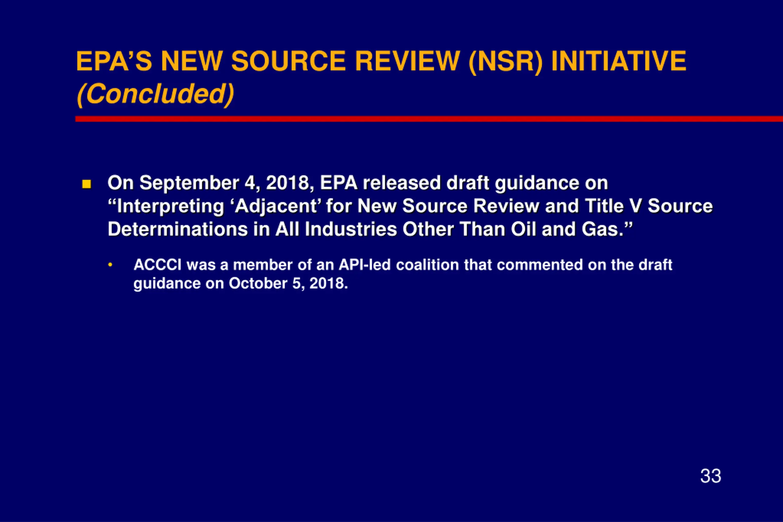 EPAS NEW SOURCE REVIEW (NSR) INITIATIVE (Concluded) On September 4, 2018, EPA released draft guidance on Interpreting Adjacent for New Source Review and Title V Source Determinations in All Industries Other Than Oil and Gas. ACCCI was a member of an API-led coalition that commented on the draft guidance on October 5, 2018. 33