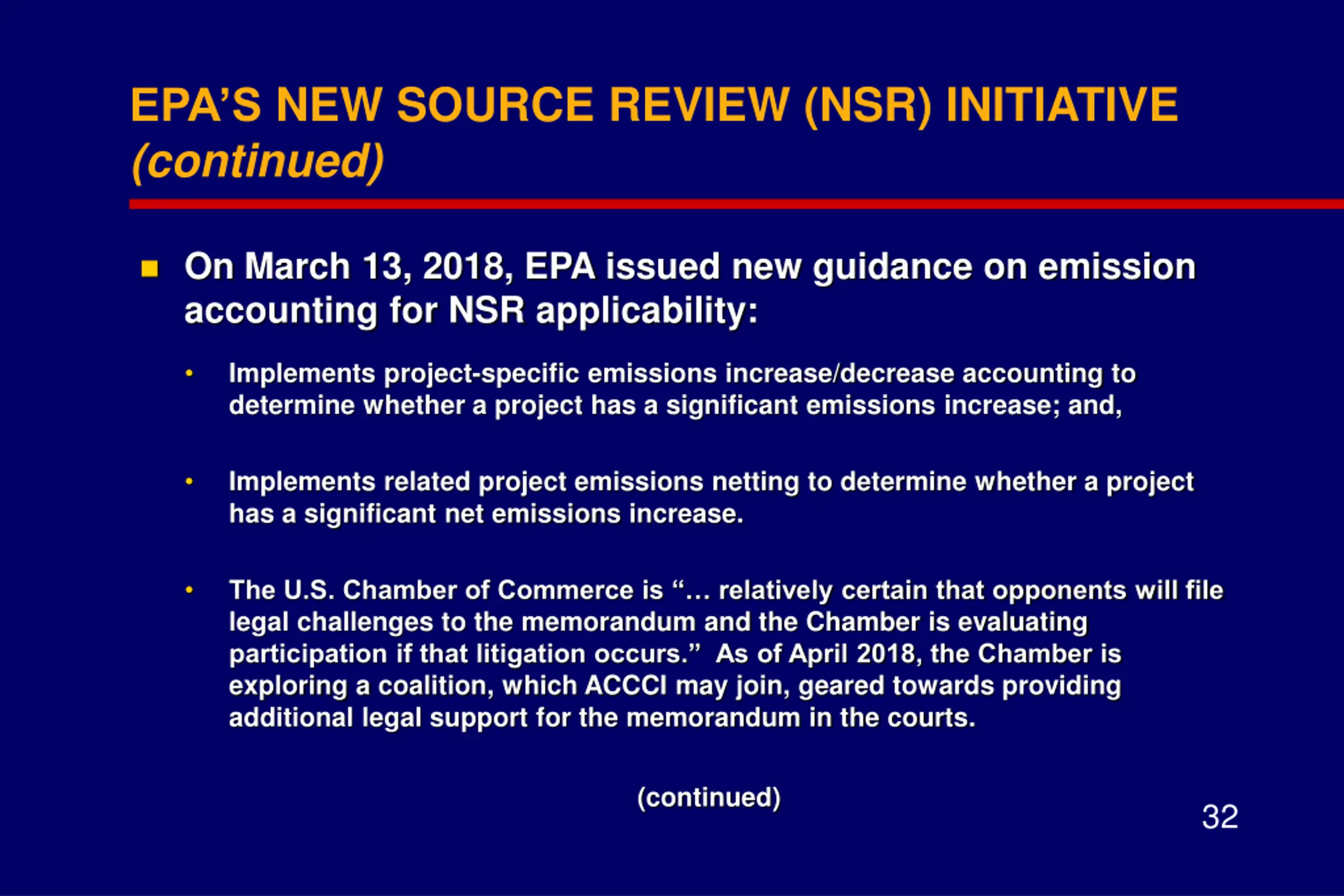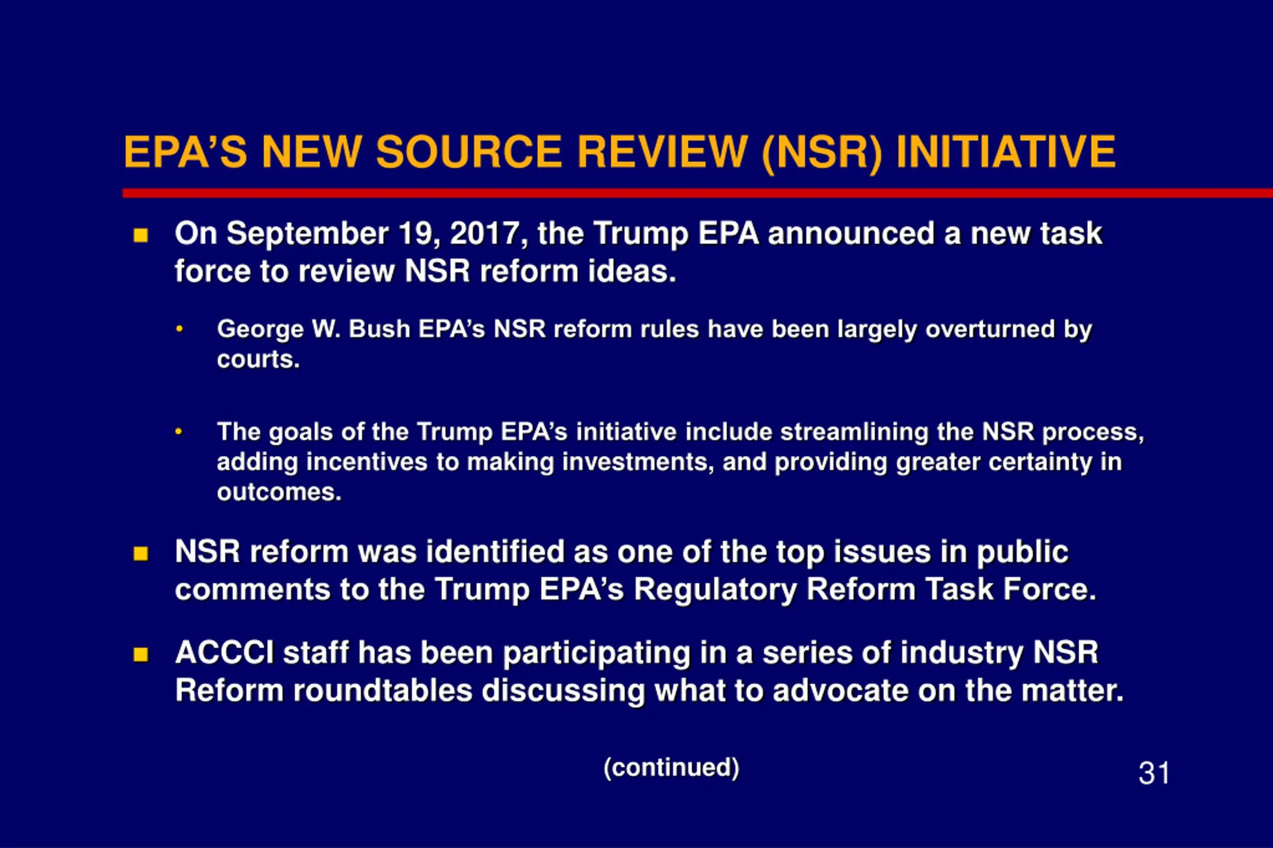 EPAS NEW SOURCE REVIEW (NSR) INITIATIVE On September 19, 2017, the Trump EPA announced a new task force to review NSR reform ideas. George W. Bush EPA s NSR reform rules have been largely overturned by courts. The goals of the Trump EPA s initiative include streamlining the NSR process, adding incentives to making investments, and providing greater certainty in outcomes. NSR reform was identified as one of the top issues in public comments to the Trump EPA s Regulatory Reform Task Force. ACCCI staff has been participating in a series of industry NSR Reform roundtables discussing what to advocate on the matter. (continued) 31