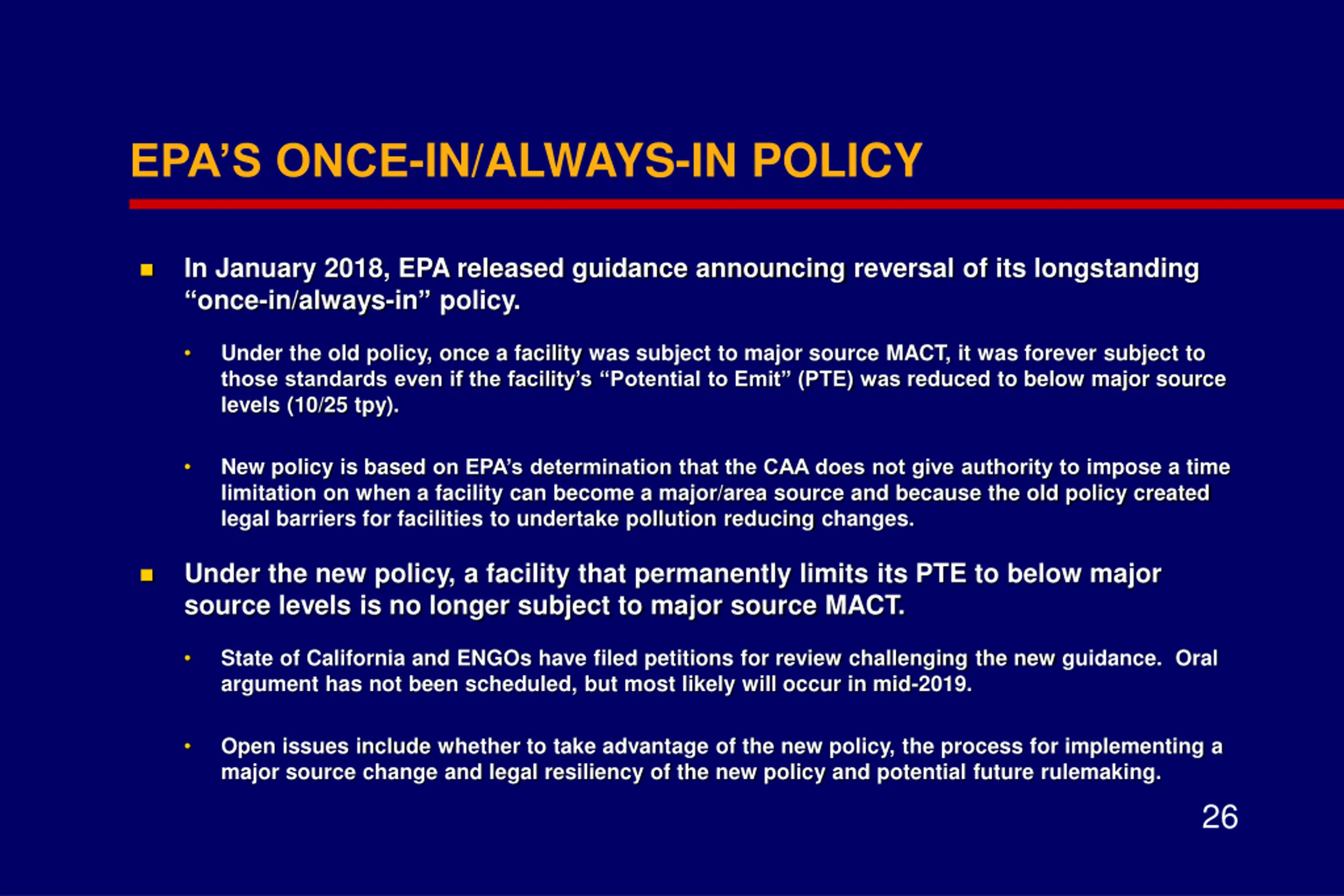 EPAS ONCE-IN/ALWAYS-IN POLICY In January 2018, EPA released guidance announcing reversal of its longstanding once-in/always-in policy. Under the old policy, once a facility was subject to major source MACT, it was forever subject to those standards even if the facility s Potential to Emit (PTE) was reduced to below major source levels (10/25 tpy). New policy is based on EPA s determination that the CAA does not give authority to impose a time limitation on when a facility can become a major/area source and because the old policy created legal barriers for facilities to undertake pollution reducing changes. Under the new policy, a facility that permanently limits its PTE to below major source levels is no longer subject to major source MACT. State of California and ENGOs have filed petitions for review challenging the new guidance. Oral argument has not been scheduled, but most likely will occur in mid-2019. Open issues include whether to take advantage of the new policy, the process for implementing a major source change and legal resiliency of the new policy and potential future rulemaking. 26