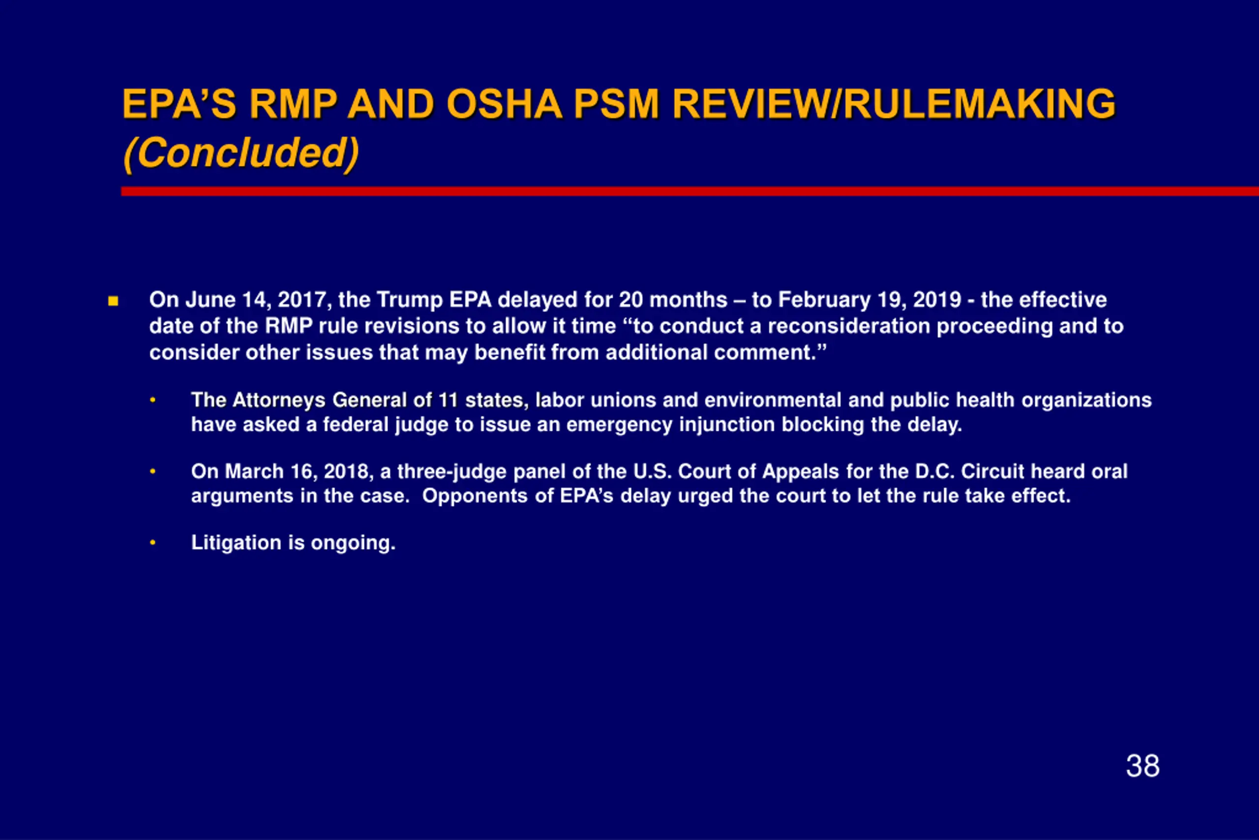 EPAS RMP AND OSHA PSM REVIEW/RULEMAKING (Concluded) On June 14, 2017, the Trump EPA delayed for 20 months to February 19, 2019 - the effective date of the RMP rule revisions to allow it time to conduct a reconsideration proceeding and to consider other issues that may benefit from additional comment. The Attorneys General of 11 states, labor unions and environmental and public health organizations have asked a federal judge to issue an emergency injunction blocking the delay. On March 16, 2018, a three-judge panel of the U.S. Court of Appeals for the D.C. Circuit heard oral arguments in the case. Opponents of EPA s delay urged the court to let the rule take effect. Litigation is ongoing. 38