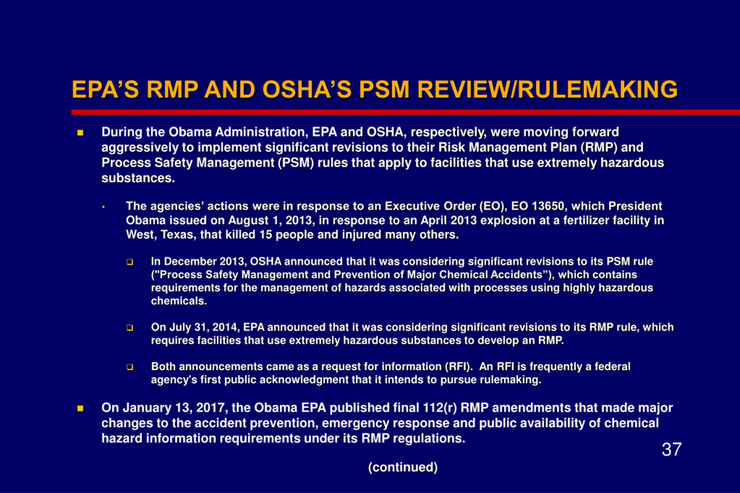 EPAS RMP AND OSHAS PSM REVIEW/RULEMAKING During the Obama Administration, EPA and OSHA, respectively, were moving forward aggressively to implement significant revisions to their Risk Management Plan (RMP) and Process Safety Management (PSM) rules that apply to facilities that use extremely hazardous substances. The agencies actions were in response to an Executive Order (EO), EO 13650, which President Obama issued on August 1, 2013, in response to an April 2013 explosion at a fertilizer facility in West, Texas, that killed 15 people and injured many others. In December 2013, OSHA announced that it was considering significant revisions to its PSM rule ("Process Safety Management and Prevention of Major Chemical Accidents ), which contains requirements for the management of hazards associated with processes using highly hazardous chemicals. On July 31, 2014, EPA announced that it was considering significant revisions to its RMP rule, which requires facilities that use extremely hazardous substances to develop an RMP. Both announcements came as a request for information (RFI). An RFI is frequently a federal agency's first public acknowledgment that it intends to pursue rulemaking. On January 13, 2017, the Obama EPA published final 112(r) RMP amendments that made major changes to the accident prevention, emergency response and public availability of chemical hazard information requirements under its RMP regulations. 37 (continued)