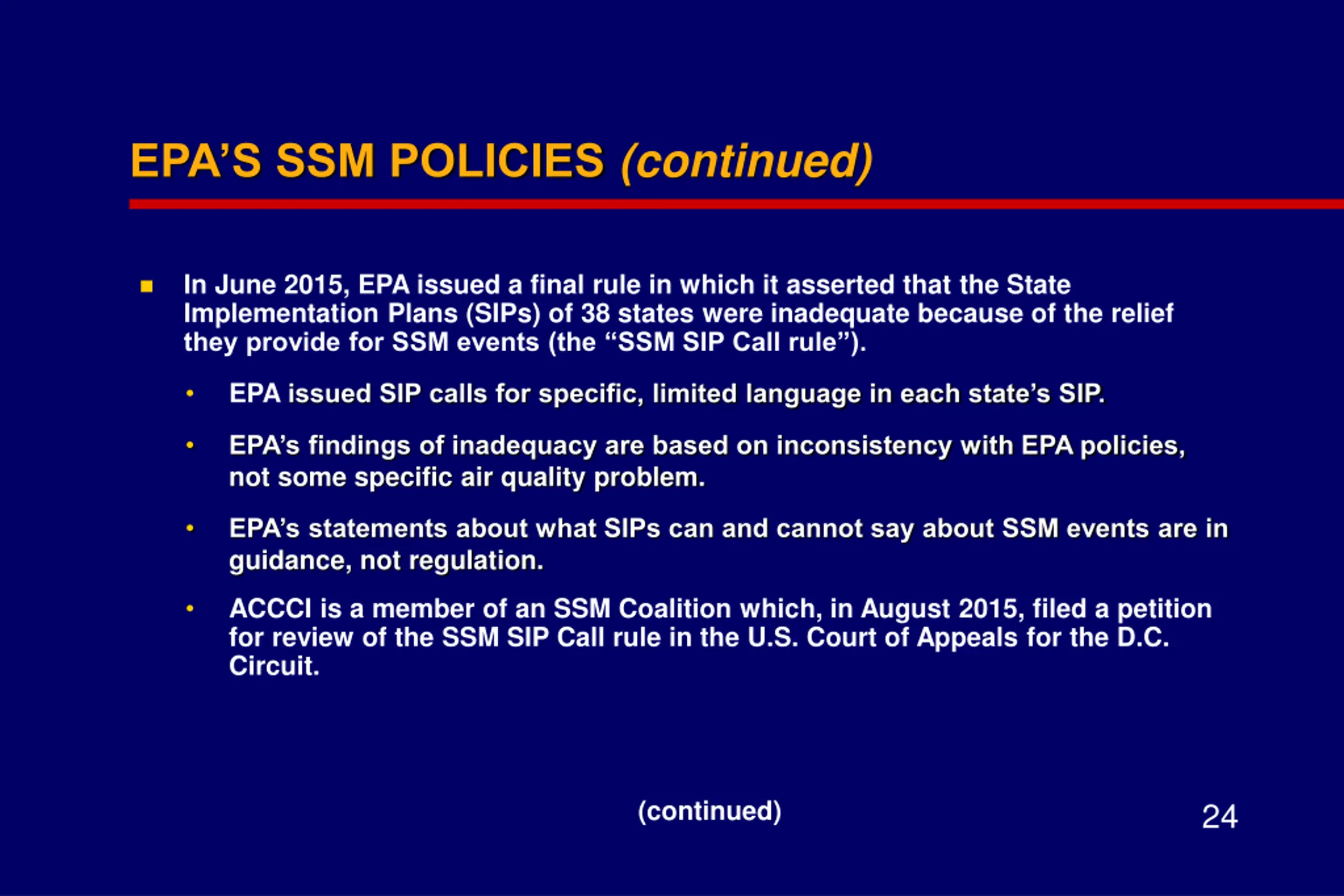 EPAS SSM POLICIES (continued) In June 2015, EPA issued a final rule in which it asserted that the State Implementation Plans (SIPs) of 38 states were inadequate because of the relief they provide for SSM events (the SSM SIP Call rule ). EPA issued SIP calls for specific, limited language in each state s SIP. EPA s findings of inadequacy are based on inconsistency with EPA policies, not some specific air quality problem. EPA s statements about what SIPs can and cannot say about SSM events are in guidance, not regulation. ACCCI is a member of an SSM Coalition which, in August 2015, filed a petition for review of the SSM SIP Call rule in the U.S. Court of Appeals for the D.C. Circuit. (continued) 24