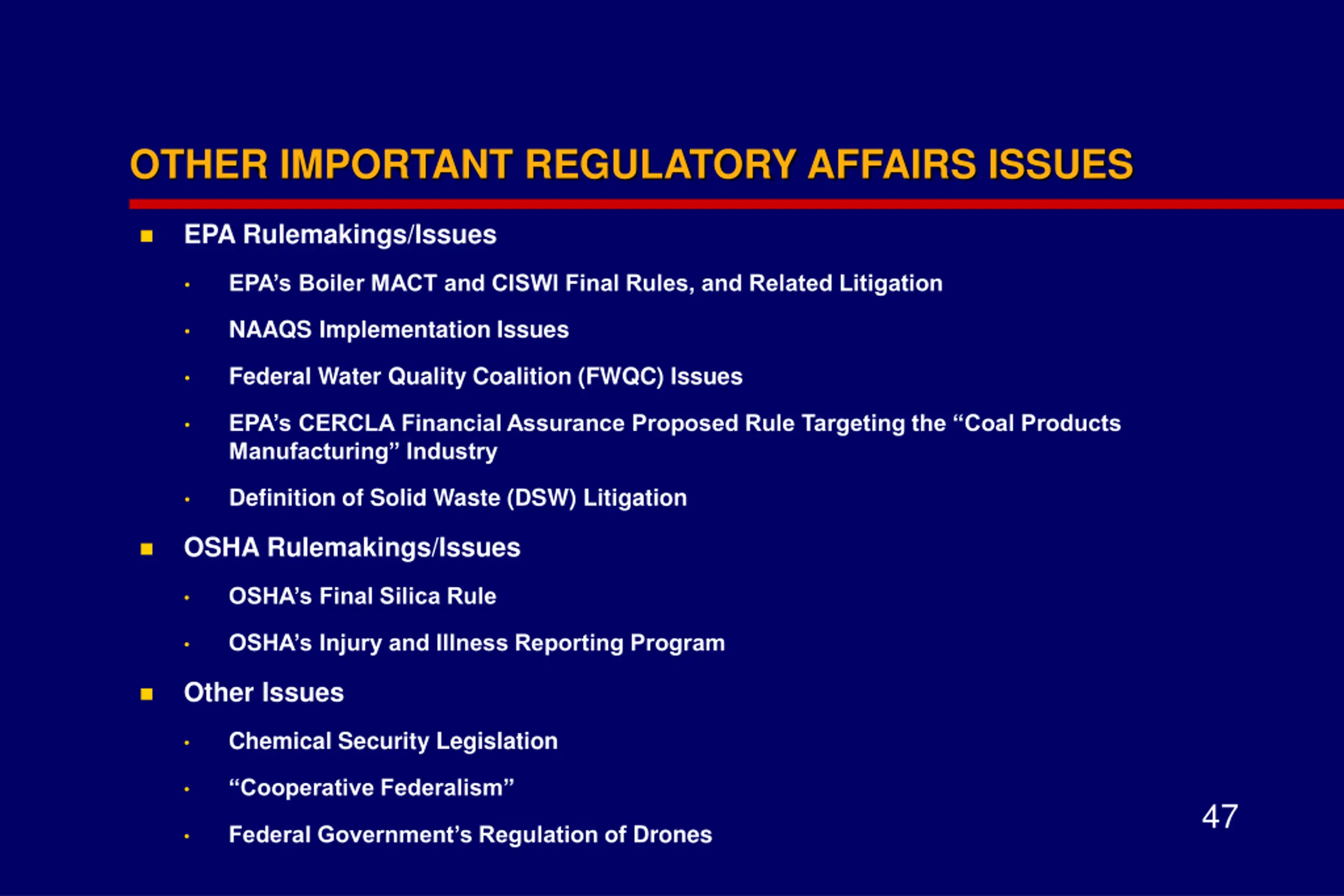 OTHER IMPORTANT REGULATORY AFFAIRS ISSUES EPA Rulemakings/Issues EPA s Boiler MACT and CISWI Final Rules, and Related Litigation NAAQS Implementation Issues Federal Water Quality Coalition (FWQC) Issues EPA s CERCLA Financial Assurance Proposed Rule Targeting the Coal Products Manufacturing Industry Definition of Solid Waste (DSW) Litigation OSHA Rulemakings/Issues OSHA s Final Silica Rule OSHA s Injury and Illness Reporting Program Other Issues Chemical Security Legislation Cooperative Federalism 47 Federal Government s Regulation of Drones
