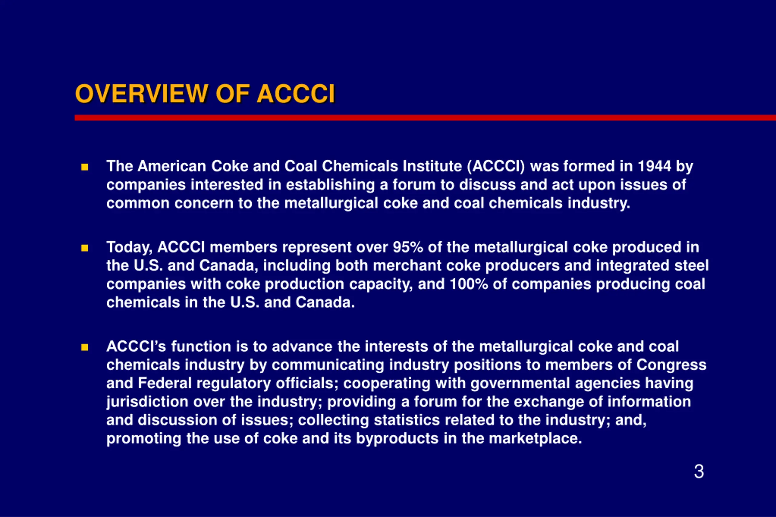 PRESENTATION OVERVIEW Overview of ACCCI/ACCCI Membership Current Status of the U.S. Coke Industry Background on the ACCCI-Managed Coke Oven Environmental Task Force (COETF) Principal Sector-Specific Regulatory Issues of Concern to the U.S. Coke Industry Principal General Industry Regulatory Issues of Concern to the Coke Industry Principal Regulatory Issues of Concern to the Coal Chemicals Industry 2 Other Important Regulatory Affairs Issues