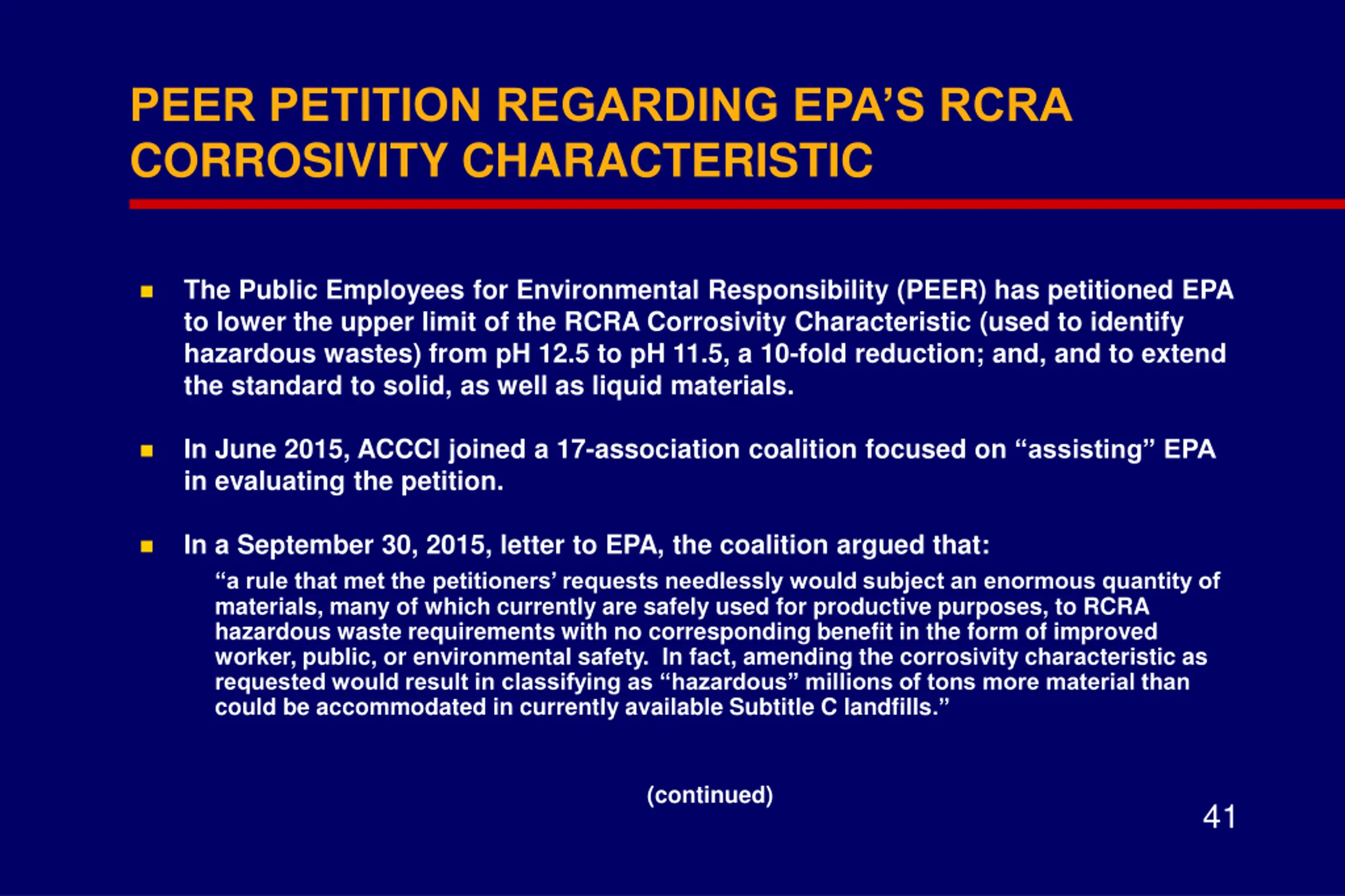 PEER PETITION REGARDING EPAS RCRA CORROSIVITY CHARACTERISTIC The Public Employees for Environmental Responsibility (PEER) has petitioned EPA to lower the upper limit of the RCRA Corrosivity Characteristic (used to identify hazardous wastes) from pH 12.5 to pH 11.5, a 10-fold reduction; and, and to extend the standard to solid, as well as liquid materials. In June 2015, ACCCI joined a 17-association coalition focused on assisting EPA in evaluating the petition. In a September 30, 2015, letter to EPA, the coalition argued that: a rule that met the petitioners requests needlessly would subject an enormous quantity of materials, many of which currently are safely used for productive purposes, to RCRA hazardous waste requirements with no corresponding benefit in the form of improved worker, public, or environmental safety. In fact, amending the corrosivity characteristic as requested would result in classifying as hazardous millions of tons more material than could be accommodated in currently available Subtitle C landfills. (continued) 41
