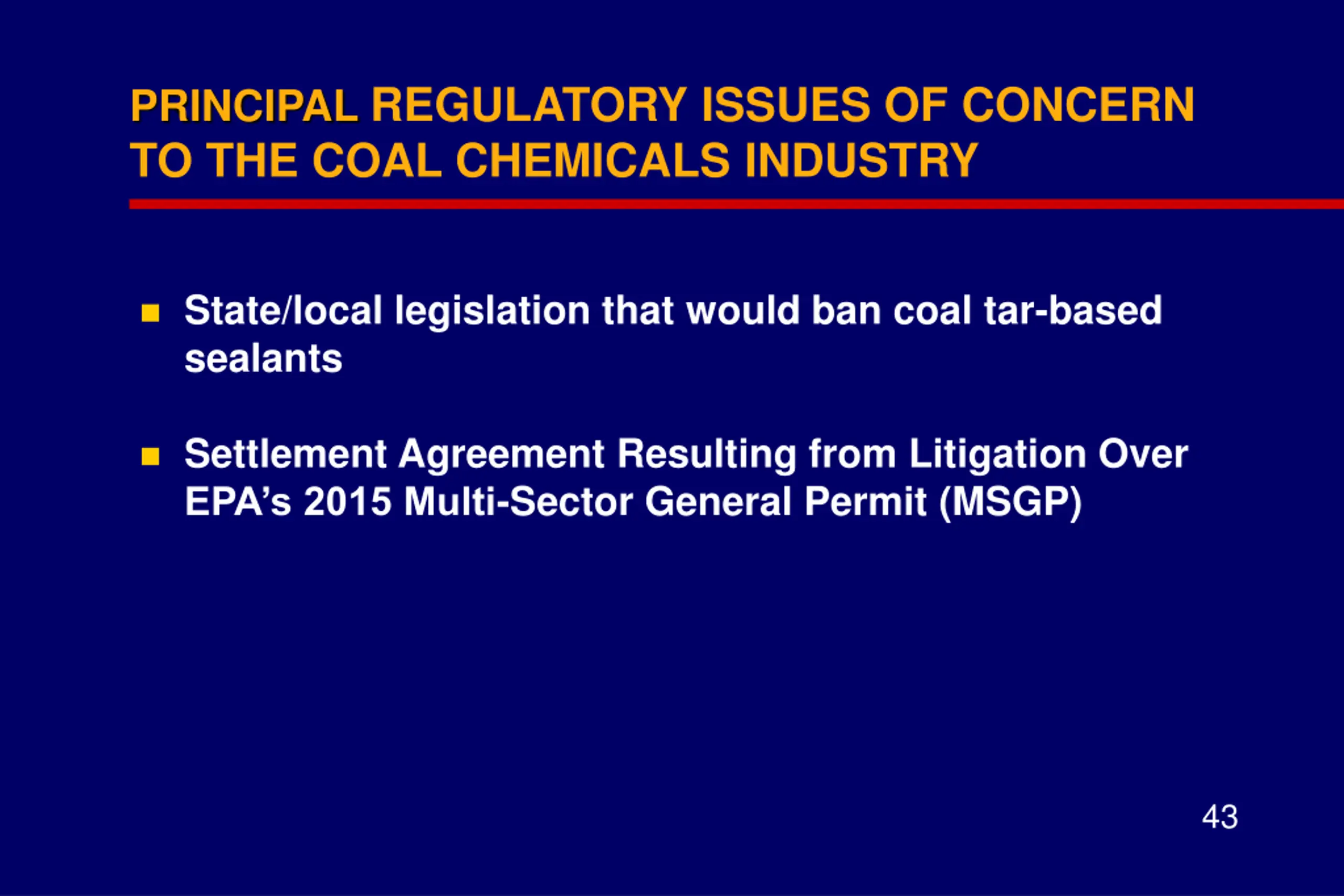 PRINCIPAL REGULATORY ISSUES OF CONCERN TO THE COAL CHEMICALS INDUSTRY State/local legislation that would ban coal tar-based sealants Settlement Agreement Resulting from Litigation Over EPA s 2015 Multi-Sector General Permit (MSGP) 43