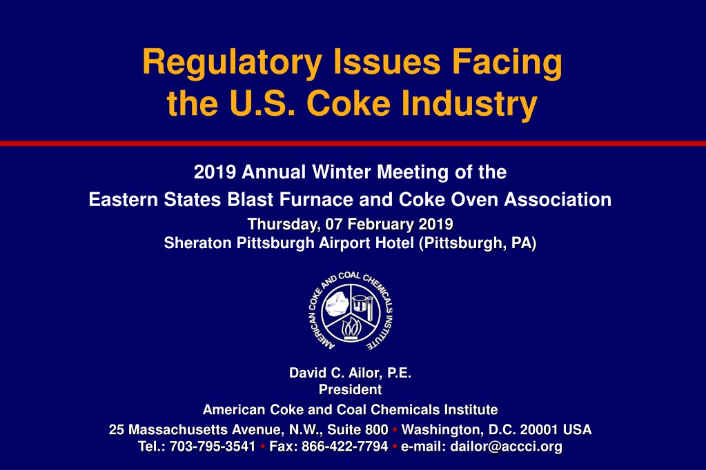 Regulatory Issues Facing the U.S. Coke Industry 2019 Annual Winter Meeting of the Eastern States Blast Furnace and Coke Oven Association Thursday, 07 February 2019 Sheraton Pittsburgh Airport Hotel (Pittsburgh, PA) David C. Ailor, P.E. President American Coke and Coal Chemicals Institute 25 Massachusetts Avenue, N.W., Suite 800 Washington, D.C. 20001 USA Tel.: 703-795-3541 Fax: 866-422-7794 e-mail: dailor@accci.org
