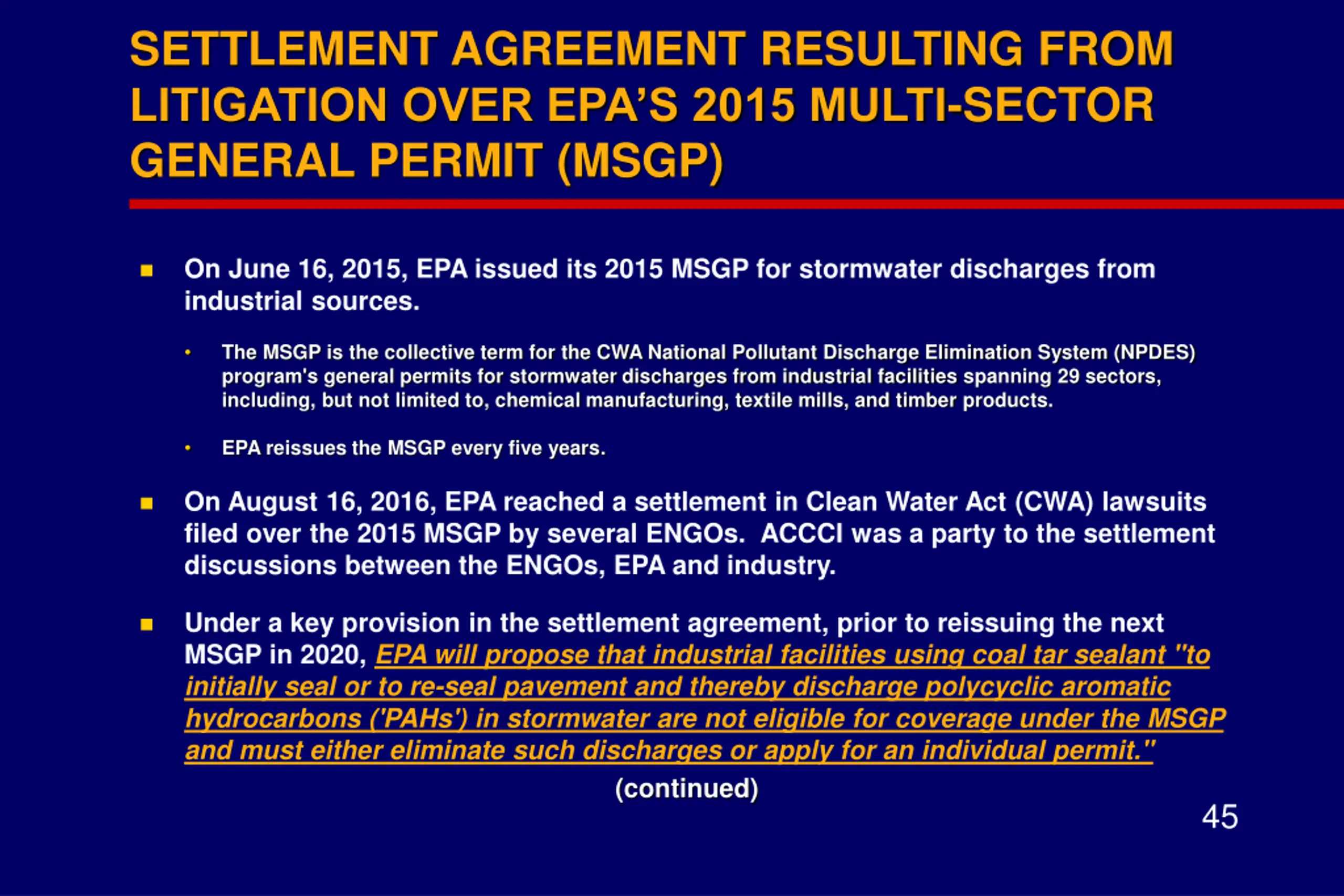 SETTLEMENT AGREEMENT RESULTING FROM LITIGATION OVER EPA S 2015 MULTI-SECTOR GENERAL PERMIT (MSGP) On June 16, 2015, EPA issued its 2015 MSGP for stormwater discharges from industrial sources. The MSGP is the collective term for the CWA National Pollutant Discharge Elimination System (NPDES) program's general permits for stormwater discharges from industrial facilities spanning 29 sectors, including, but not limited to, chemical manufacturing, textile mills, and timber products. EPA reissues the MSGP every five years. On August 16, 2016, EPA reached a settlement in Clean Water Act (CWA) lawsuits filed over the 2015 MSGP by several ENGOs. ACCCI was a party to the settlement discussions between the ENGOs, EPA and industry. Under a key provision in the settlement agreement, prior to reissuing the next MSGP in 2020, EPA will propose that industrial facilities using coal tar sealant "to initially seal or to re-seal pavement and thereby discharge polycyclic aromatic hydrocarbons ('PAHs') in stormwater are not eligible for coverage under the MSGP and must either eliminate such discharges or apply for an individual permit." (continued) 45
